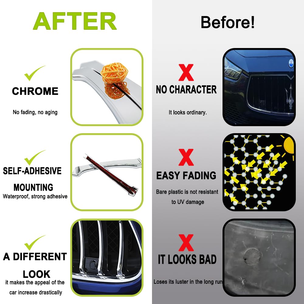 Q: Will the chrome trim withstand harsh weather conditions?A: Yes, the chrome trim features a waterproof and shockproof design. The dedicated adhesive tape ensures that it remains securely in place, even under severe vibrations or weather conditions.