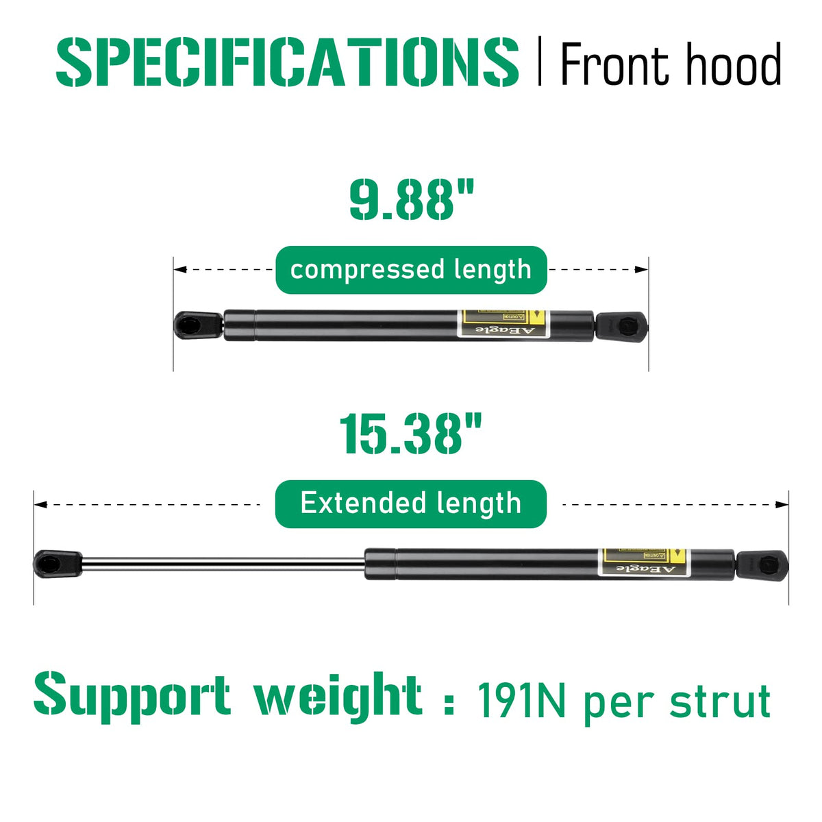 Q: What are the specifications of the lift supports?A: The lift supports have an extended length of 15.38 inches and a compressed length of 9.88 inches, with a support weight capacity of 191N per strut.