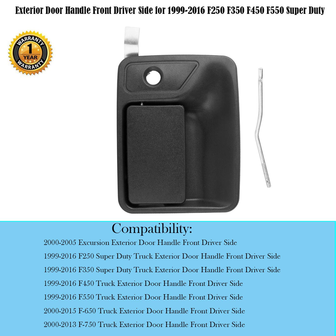 Q: What vehicles are compatible with this door handle?A: This exterior door handle is compatible with 1999-2016 Ford F250, F350, F450, F550 Super Duty models, as well as 2000-2005 Ford Excursion, 2000-2015 F650, and 2000-2013 F750.