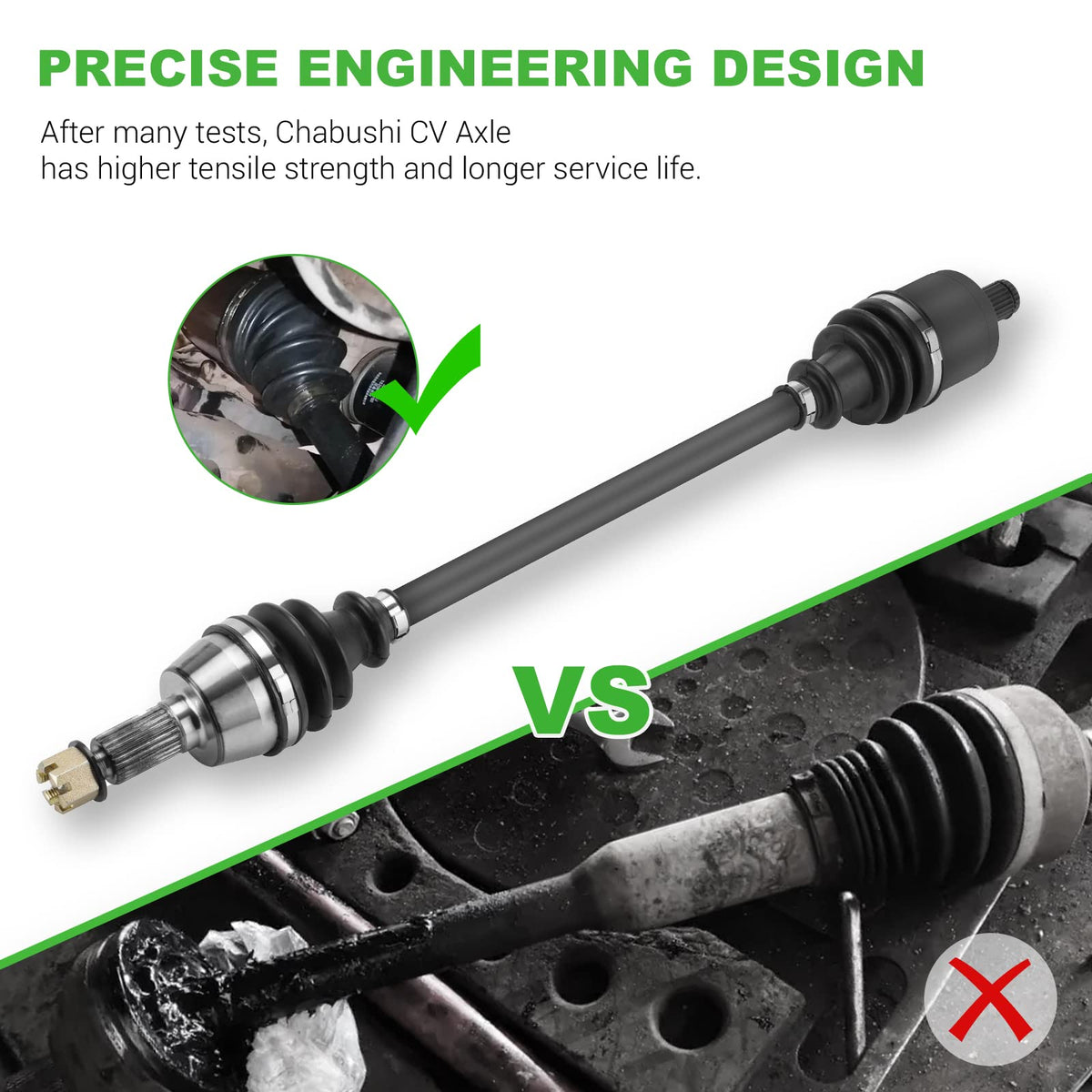 The Chabushi axle was designed to be stronger, longer lasting, and a more dependable axle than anything else. Replaces Number: 1332637 Fits Model: For Polaris: Brutus : 2013-2014 Brutus + Cab : 2013-2014 Brutus HD : 2013-2014 Brutus HDPTO : 2013-2016 Brutus HDPTO Deluxe : 2015-2016 Brutus LE : 2013 For Ranger 1000 : 2020 For Ranger 1000 EPS : 2020 For Ranger 1000 Premium : 2020 For Ranger 570 Crew : 2015 For Ranger 570 Crew EPS : 2015 For Ranger 570 Crew EPS Full-Size : 2015 For Ranger 570 Crew Full-Size : 2015 For Ranger 570 Full-Size : 2015-2016 For Ranger 570 XP : 2016 For Ranger 900 Crew : 2014-2019 For Ranger 900 XP : 2016-2017 For Ranger 900 XP EPS : 2016-2017 For Ranger 900 XP EPS High Lifter Edition : 2016 For Ranger 900 XP EPS Hunter Deluxe Edition : 2016 For Ranger 900 XP EPS Hunter Edition : 2016 For Ranger 900 XP EPS for Northstar Edition : 2016 For Ranger 900 XP EPS Trail Edition : 2016 For Ranger 900-6 Crew : 2015-2016 For Ranger 900-6 Crew EPS : 2015-2016 For Ranger Crew 1000 : 2020 For Ranger Crew 1000 EPS : 2020 For Ranger Crew 1000 Premium : 2020 For Ranger Crew XP 1000 : 2017 For Ranger Crew XP 1000 EPS : 2017-2020 For Ranger Crew XP 1000 EPS High Lifter Edition : 2017 For Ranger Crew XP 1000 EPS for Northstar HVAC Edition : 2017 & 2020 For Ranger Crew XP 1000 EPS Premium : 2020 For Ranger Crew XP 1000 for NorthStar Premium : 2020 For Ranger Crew XP 1000 for NorthStar Ultimate : 2020 For Ranger Crew XP 1000 for Texas Edition : 2020 For Ranger Crew XP 900 : 2016 For Ranger Crew XP 900 EPS : 2016 For Ranger Diesel : 2015 & 2017 For Ranger Diesel HST : 2014-2015 & 2017 For Ranger Diesel HST Deluxe : 2014-2015 & 2017 For Ranger XP 1000 : 2017 & 2020 For Ranger XP 1000 EPS : 2017 For Ranger XP 1000 EPS High Lifter Edition : 2017 For Ranger XP 1000 EPS Hunter Edition : 2017 For Ranger XP 1000 EPS for Northstar HVAC Edition : 2017 & 2020 For Ranger XP 1000 EPS Premium : 2020 For Ranger XP 1000 EPS Ranch Edition : 2017 For Ranger XP 1000 for NorthStar Premium : 2020 For Ranger XP 1000 for NorthStar Ultimate : 2020 For Ranger XP 1000 for Texas Edition : 2020 For RZR S 570 EPS : 2017 For RZR S 800 : 2009-2014 Includes: 1x Front Axle --Maximized CV and shaft size for ultimate strength. --High articulation angles. --4340 Chromoly for unmatched longevity. --Precision engineered cage and housing for reduced friction and a smooth range of motion. --Synthetic grease to keep CVs cool each time you ride. Note: Please confirm your ATV year, make, and model compatibility prior to purchasing.