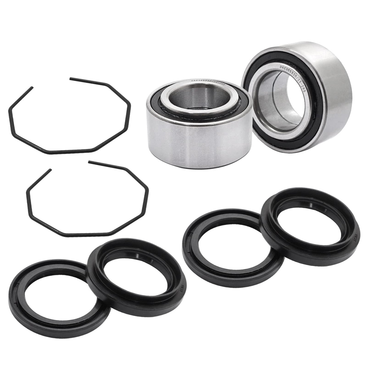 Q: What materials are used in the JAVIK Wheel Hub Bearings and seals?A: The seals in the JAVIK Wheel Hub Bearings Seals Kit are made from durable rubber, designed to prevent dust, water, and sand from entering the ATV. The bearings are constructed from long-lasting steel, which helps reduce wheel shake and abnormal noise when replaced regularly.