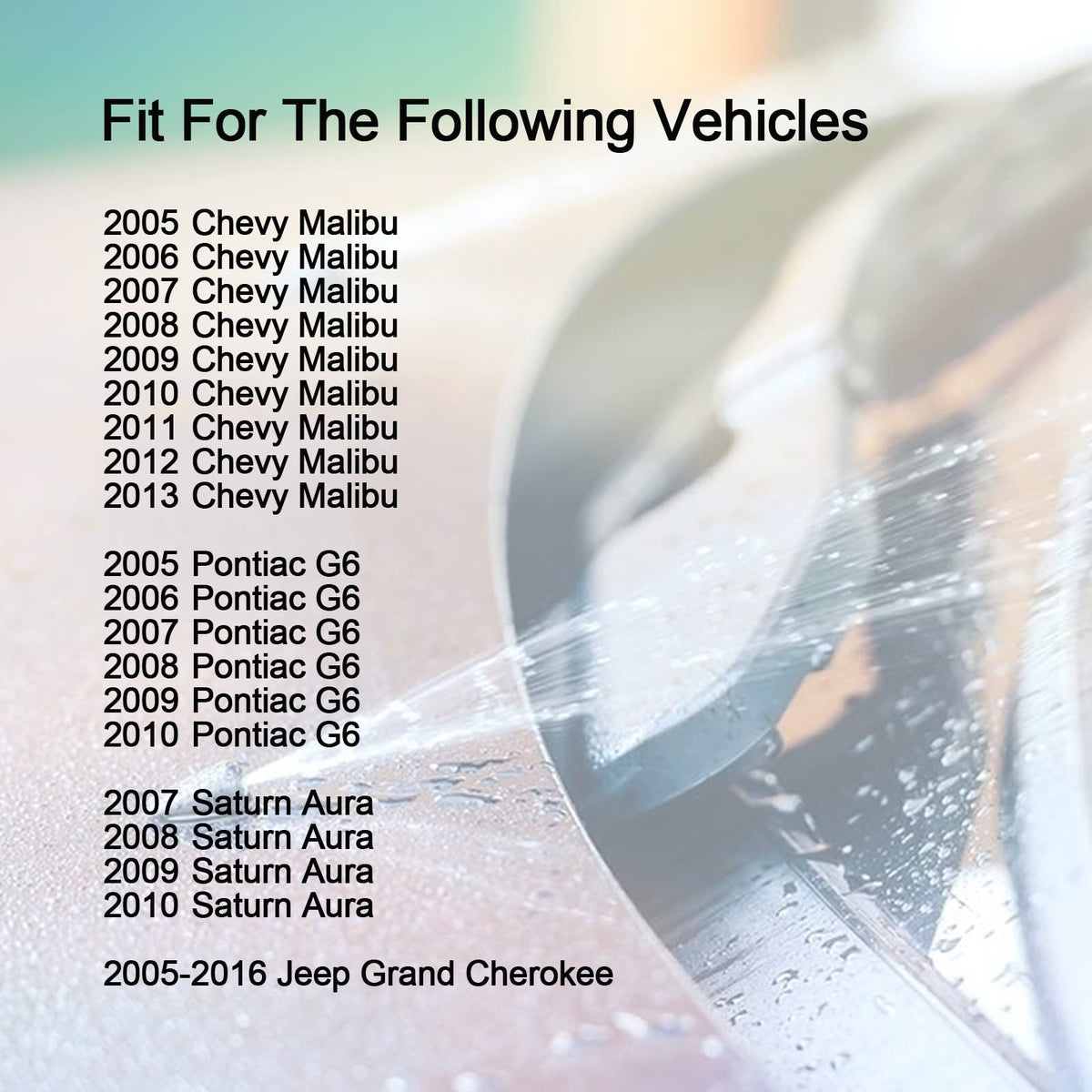 Q: What vehicles are compatible with the Front Windshield Washer Nozzle Kit?A: The Front Windshield Washer Nozzle Kit is compatible with the following vehicles: 2005 - 2016 Jeep Grand Cherokee, 2005 - 2013 Chevy Malibu, 2005 - 2010 Pontiac G6, and 2007 - 2010 Saturn Aura.