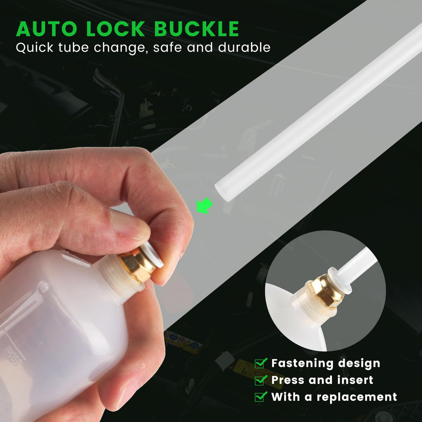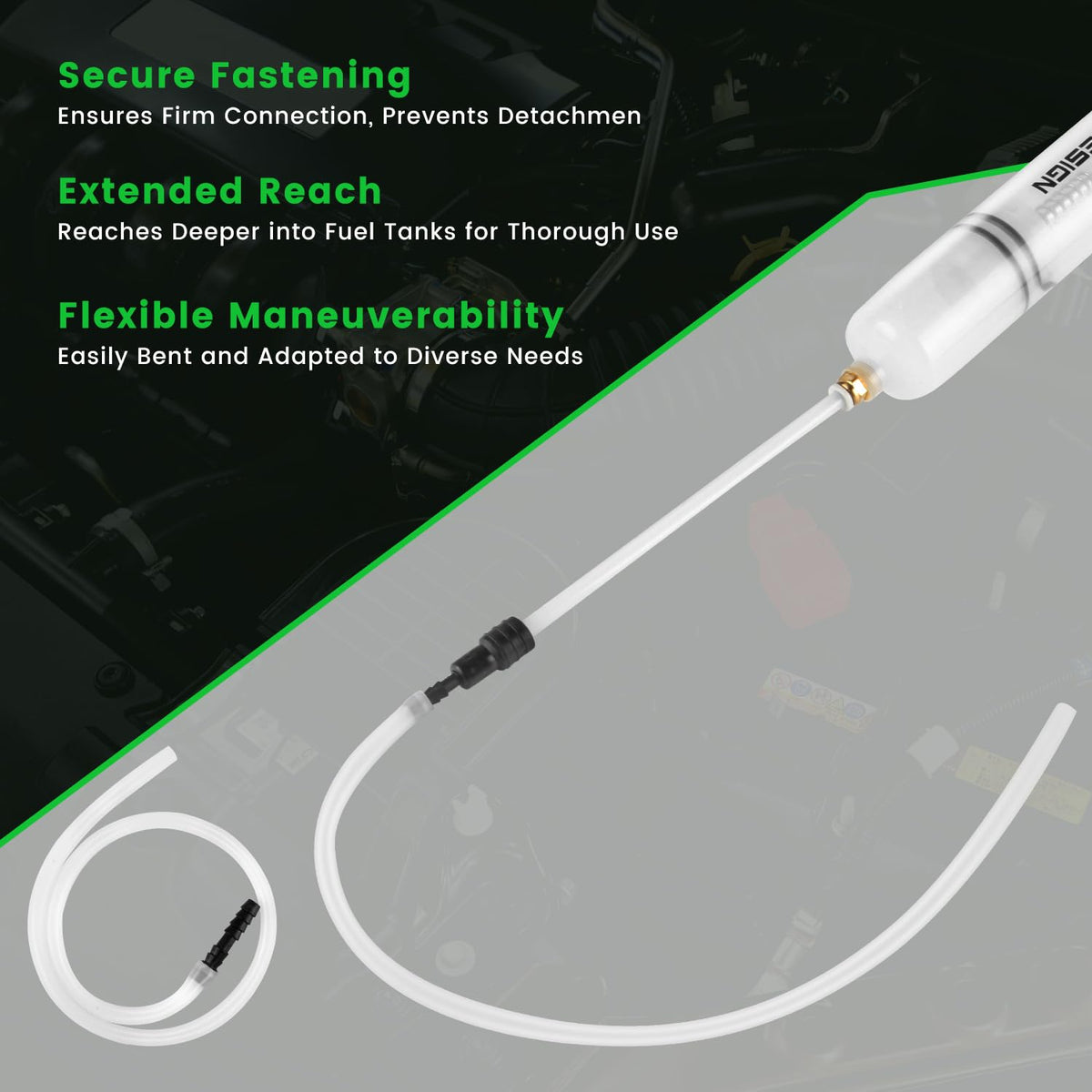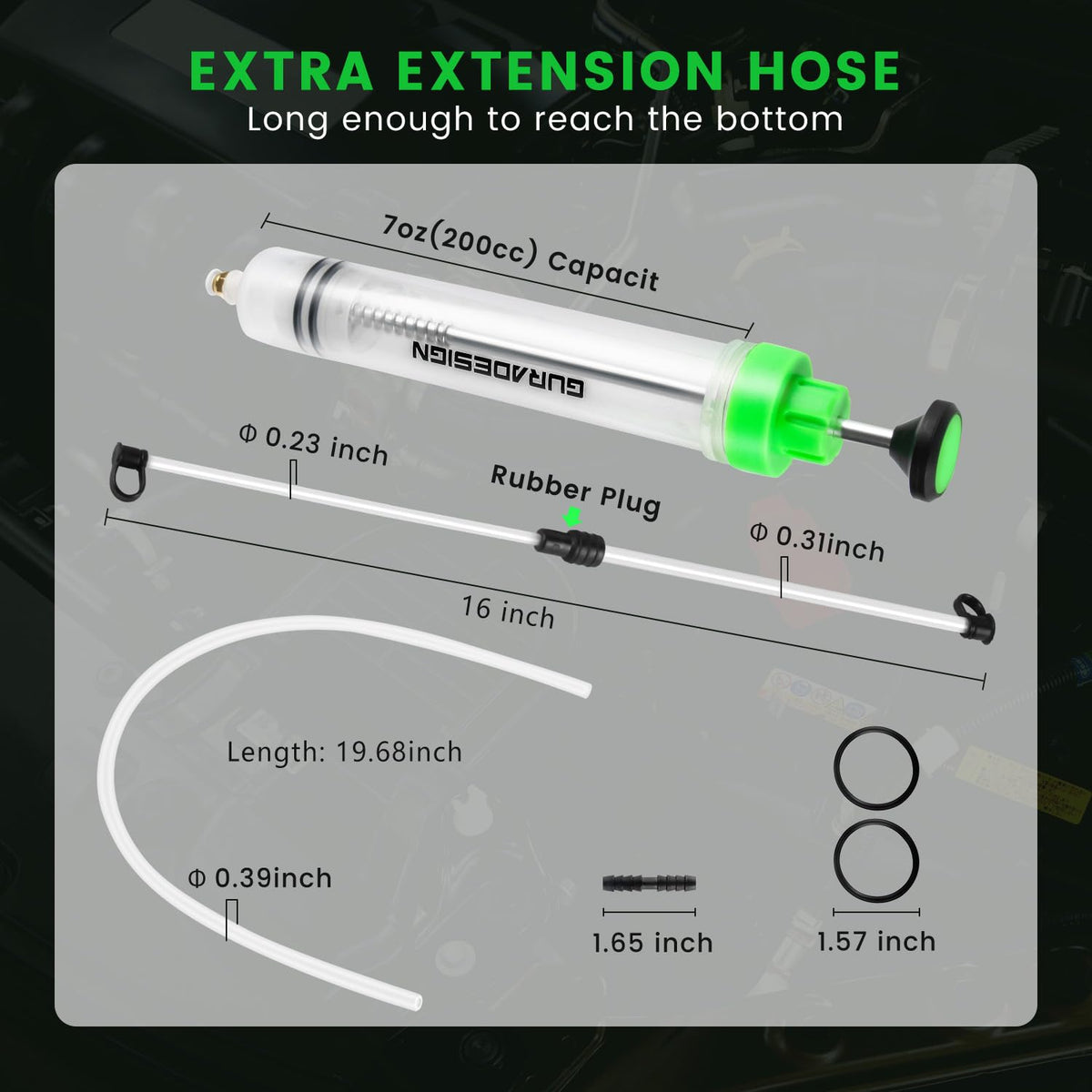 The syringe type liquid extractor is equipped with extension tubes with outer diameters of 0.24 inches and 0.32 inches, with a connection time of up to 40 centimeters. The length is long enough to remove difficult to reach areas for disassembly and replacement of transmission fluid, power steering fluid, transmission fluid, antifreeze, and brake fluid.