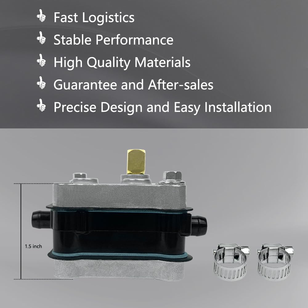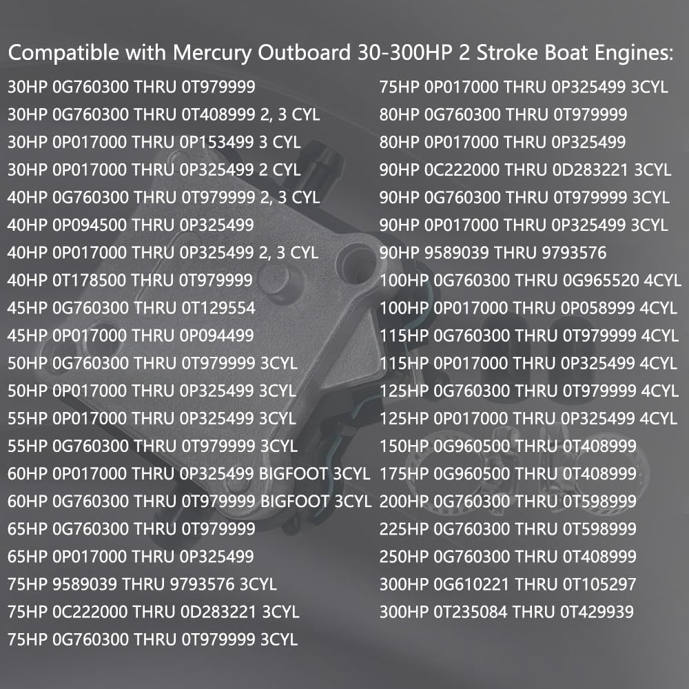 Q: What is the compatibility range of the Fuel Pump for Mercury Outboards?A: This fuel pump is compatible with Mercury Outboard 2 Stroke engines ranging from 30HP to 300HP. It fits various models including 30HP, 40HP, 50HP, 60HP, and more, ensuring a broad application for your outboard needs.