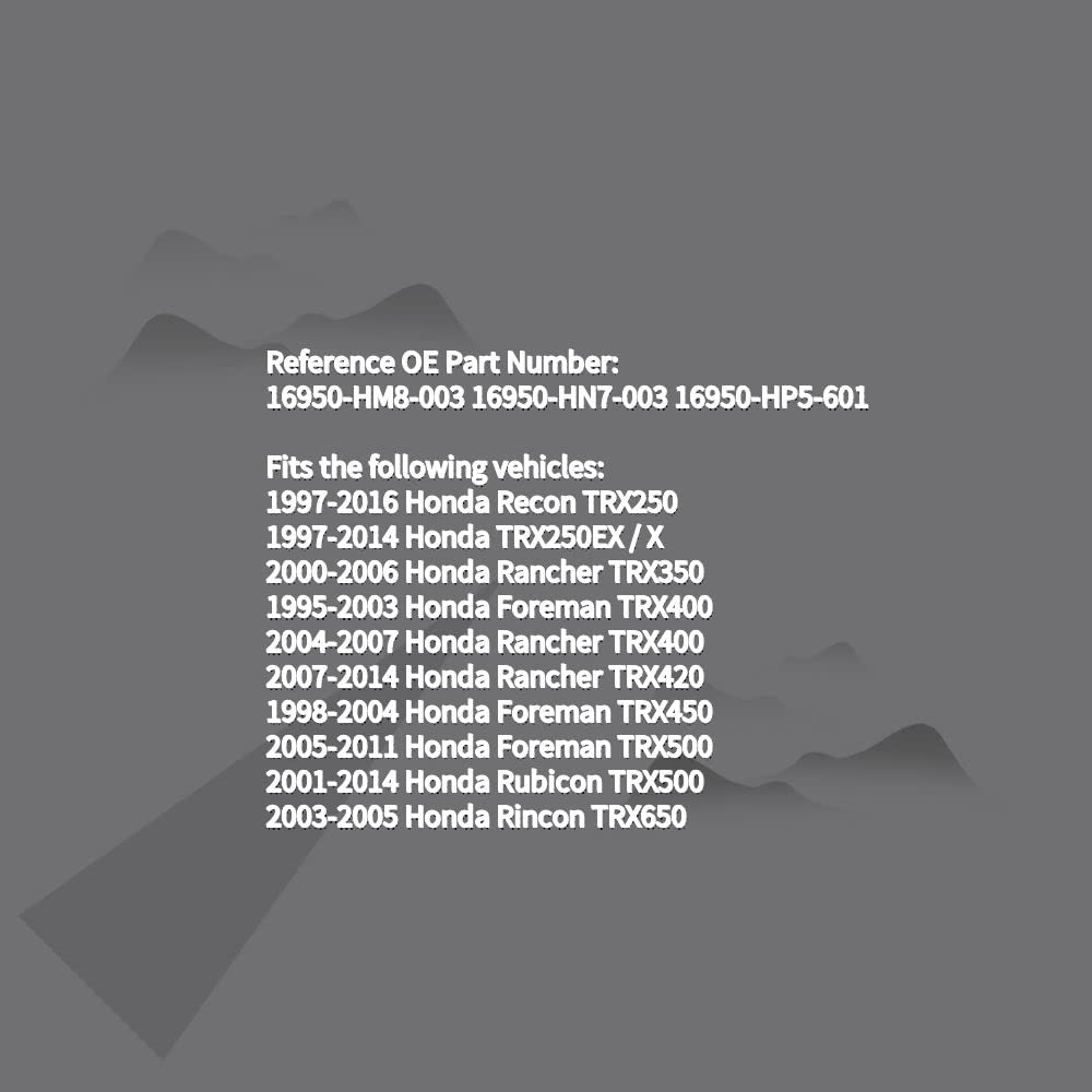 Feature: Manufactured from high quality materials, which will built to long lasting durability and performance Direct replacement for a proper fit and easy installation, meets or exceeds OEM standards Reference OE Part Number: 16950-HM8-003 16950-HN7-003 16950-HP5-601 Fits the following vehicles: 1997-2016 Honda Recon TRX250 1997-2014 Honda TRX250EX / X 2000-2006 Honda Rancher TRX350 1995-2003 Honda Foreman TRX400 2004-2007 Honda Rancher TRX400 2007-2014 Honda Rancher TRX420 1998-2004 Honda Foreman TRX450 2005-2011 Honda Foreman TRX500 2001-2014 Honda Rubicon TRX500 2003-2005 Honda Rincon TRX650