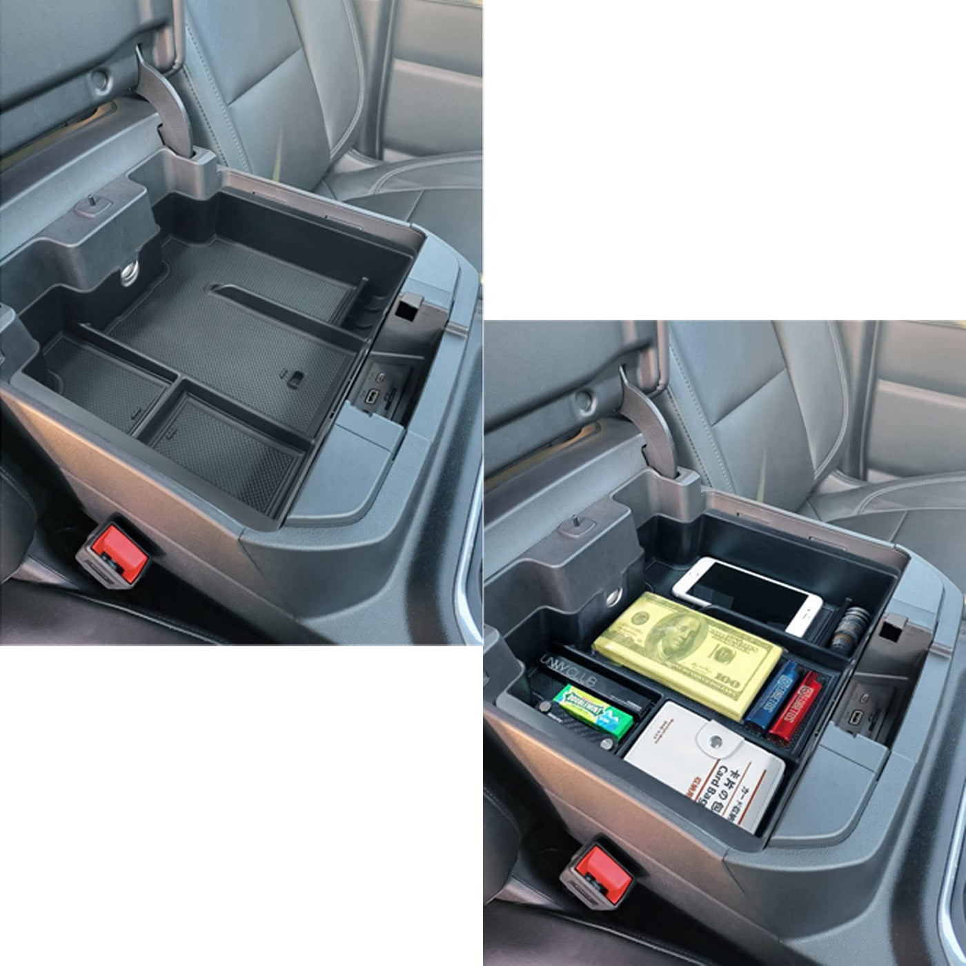 Special Design: There are holes for the USB cable to pass through the tray and for the light to shine the center console. Made of solid ABS plastic material. Maximize Storage Space: There are two layers to store things. If you need extra organization within your console, this is for you! Keep all your things organized and put together with ease! Great way to separate items: Provides quick access to frequently needed items like phone, coins, sunglasses, pens, keys, business cards, etc, but leaves a lot of room underneath for heavier and larger items. Compatible Vehicles: Made for 2019-2022 Silverado/Sierra 1500 and 2020-2022 2023 Silverado/Sierra 2500 HD 3500 HD Accessories(Fits the console with bucket seats ONLY!) Note: It wont fit the console with a safe vault. Fits like a glove: Precisely matches your Silverado/Sierra console armrest. A Breeze to Install: No tools needed for installation! Just drop right in, you will have all of the things at hand.