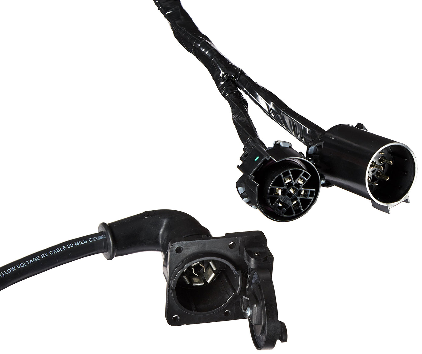 Chevrolet Silverado 1500; Chevrolet Silverado 1500 HD; Chevrolet Silverado 2500; Chevrolet Silverado 2500 HD; Chevrolet Silverado 3500; Chevrolet Silverado 3500 HD; Dodge Ram 1500; Dodge Ram 2500; Dodge Ram 3500; Ford F-150; Ford F-150 Heritage; Ford F-250; Ford F-250 Super Duty; Ford F-350 Super Duty; Ford F-450 Super Duty; Ford F-550 Super Duty; GMC Sierra 1500; GMC Sierra 1500 HD; GMC Sierra 2500; GMC Sierra 2500 HD; GMC Sierra 3500; GMC Sierra 3500 HD; Lincoln Mark LT; Nissan Titan; RAM 1500; RAM 2500; RAM 3500; Toyota TundraFifth Wheel Harness90 Degree Fifth Wheel Adapter Harness; 7-Way Flat Pin Connector Assembly 9 ft.; Dodge; Ford; GM; RAM/ToyotaFifth Wheel Adapter HarnessFifth Wheel Harness7-Way 90 degree connector molded to heavy duty 7-way insulated cable for fifth wheel or gooseneck trailer applications. Allows remote wiring in pickup beds or other hard to access areas. 90 degree molded from flame retardant material. Features a patented mounting bracket that allows for installation in virtually all pickup models and styles and includes self-tapping stainless steel mounting screws. Manufactured with UL listed 10/2, 12/1 and 14/4 jacketed cable.w/ 9 ft. cableFifth Wheel Harness