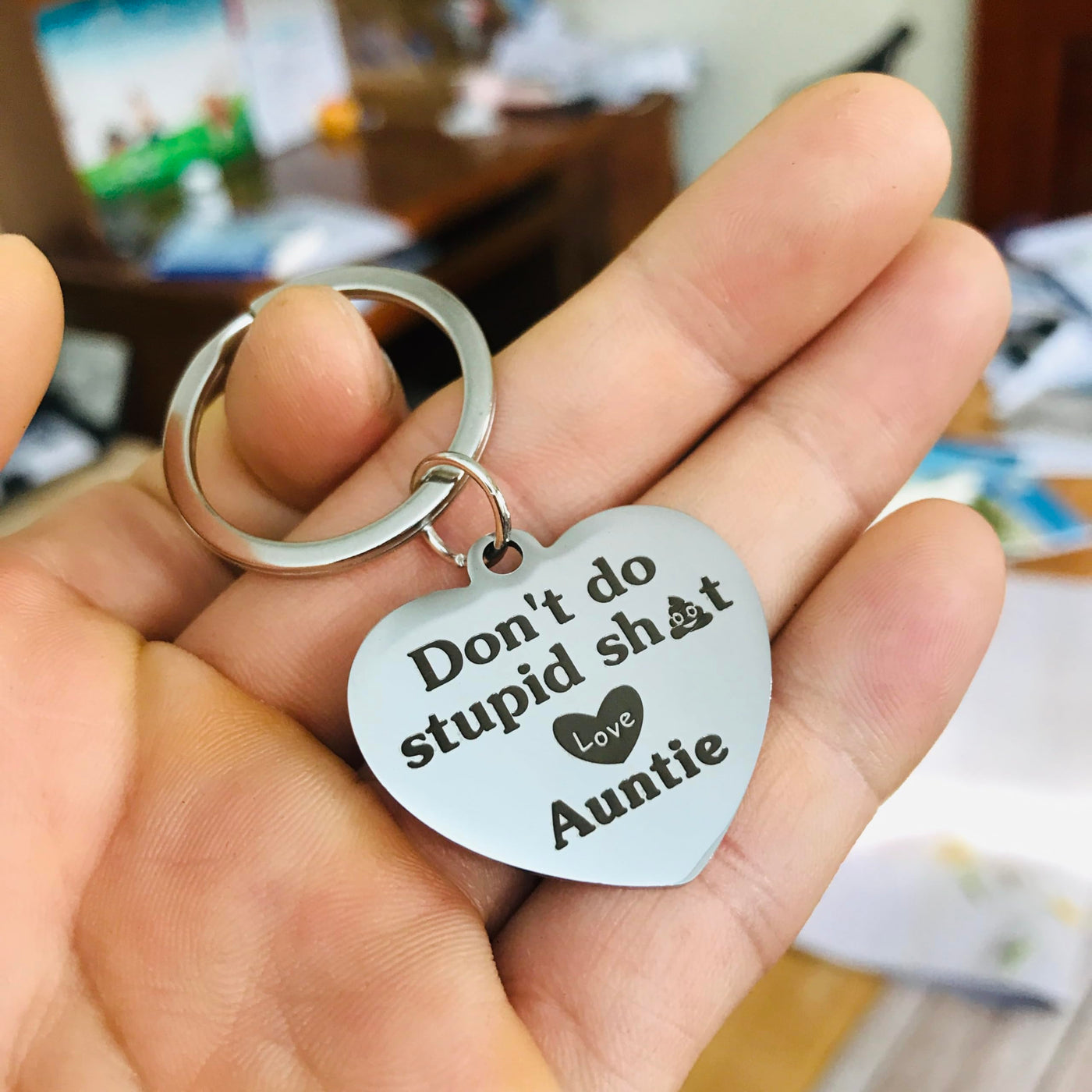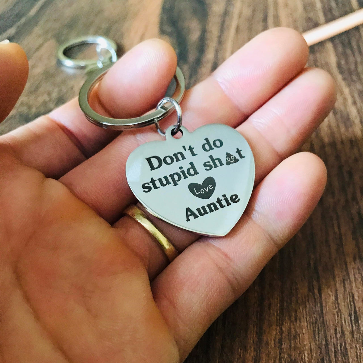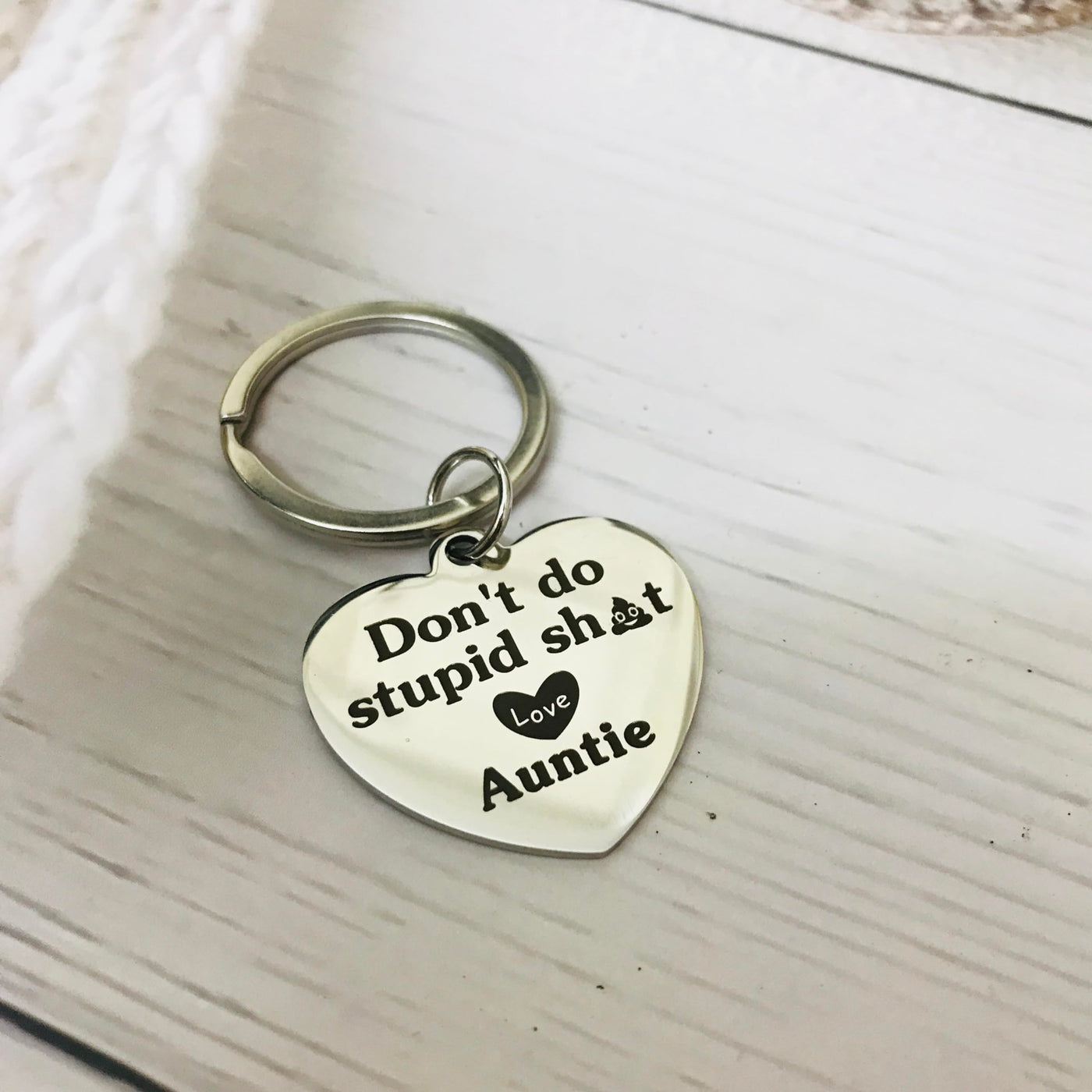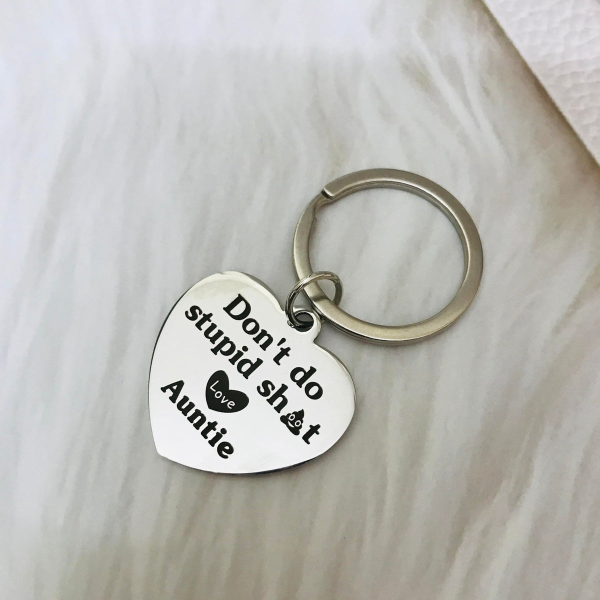 Funny Keychain Say Don't Do Stupid Shit Love Auntie Keychain from Aunt For Niece or NephewThis keychain is the perfect gift for your Nephew or Niece who has just earned their driver's license, gotten their first car, or is experiencing the freedom of driving for the first time. It's a humorous and thoughtful gift designed to put a big smile on their face.Ideal as a small yet meaningful gift, this keychain serves as a constant reminder for your kids to make the right choices. It's a funny and loving token from Aunt or Auntie to their Nephew or Niece.Perfect for a variety of milestones, this keychain makes as gift for: - Back-to-school events - Going off to college - Coming of age celebrations - Moving out or leaving home Gift Ideas: - Children's Day gift - Christmas stocking stuffer - Driver's license gift - Valentine's Day present - Graduation gift - New driver gift - Birthday Gift Coming of age gift This keychain is not just a practical item but a heartfelt message from Auntie to their goddaughter, reminding them to stay safe and make good decisions on their new journey.