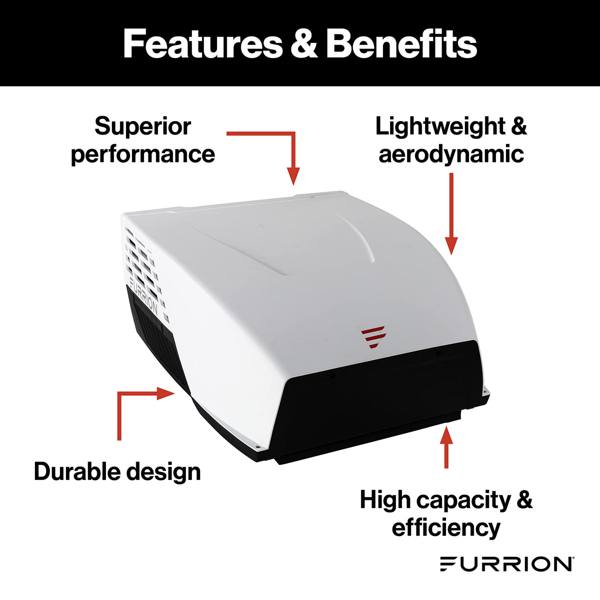 The aerodynamically designed, mid-profile Chill HE RV roof air conditioner by Furrion provides stable temperature control, improved running efficiency and reduced operating noise to meet the demands of any mobile living condition. It is engineered with dual-fan technology to be up to 40% more efficient (EER) over single-fan models. One fan pushes cold air from the compressor into the RV, while the other keeps the primary fan cool. This allows for optimal fan speed, less heat generation and overall increased airflow.The Furrion Chill HE has a lightweight, aerodynamic design for less wind resistance and maximum fuel efficiency on the road. A lightweight, insulated heat exchanger housing protects the unit from the outdoor elements, and it is constructed with Vibrationsmart and Climatesmart technologies to withstand rigorous conditions and environments.The Furrion Chill HE RV AC unit easily bolts into place and comes with complete step-by-step instructions for a hassle-free installation. Conversion kits are offered if upgrading from a competitors product. The full system is required for operation, including the air conditioner unit, thermostat, air distribution box and controller (sold separately). Choose the best configuration for your RVs size and type for a unique camper AC unit that fits your exact needs.
