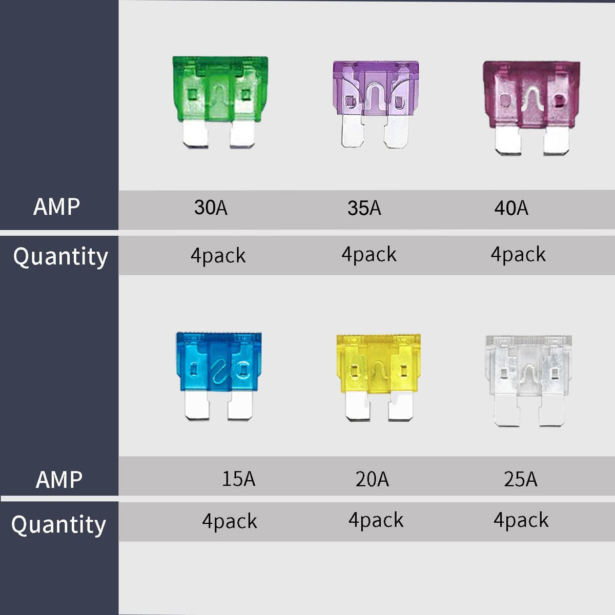 Q: How many fuses are included with the Fuse Holder ATC/ATO?A: The Fuse Holder ATC/ATO includes a total of 24 standard car fuses, which consist of 4 fuses each of 15A, 20A, 25A, 30A, 35A, and 40A. This variety allows for versatile use in different automotive applications.