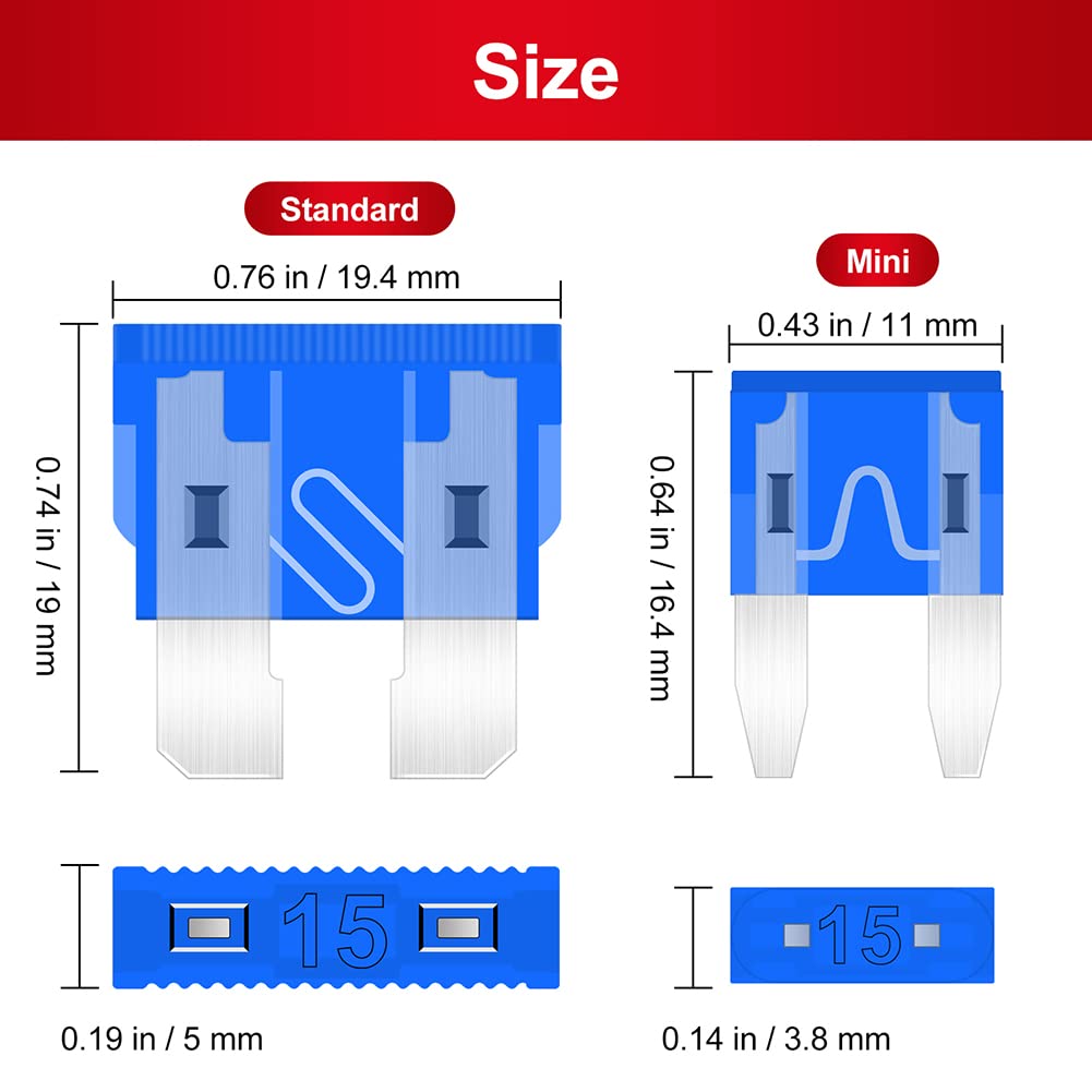 Q: What is included in the Fuses Car Fuses Assortment Kit?A: The kit includes a total of 168 fuses, consisting of 72 standard fuses and 96 mini fuses, covering 10 commonly used amperage ratings from 2A to 40A, along with 2 fuse pullers for easy installation.