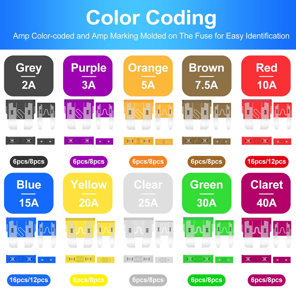 Q: How can I identify the correct fuse from the assortment?A: Each fuse in the assortment kit is clearly marked with its amperage rating and color-coded for easy identification, allowing you to quickly find the right fuse for your needs.