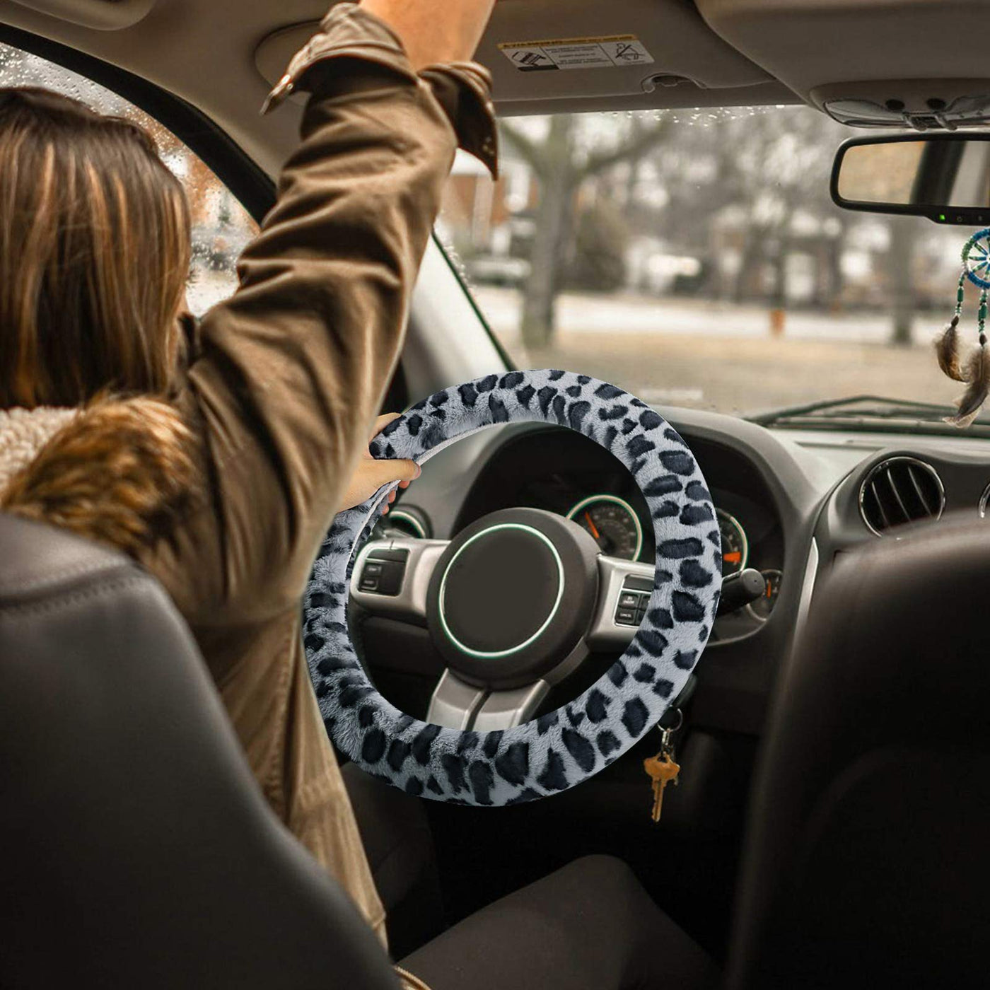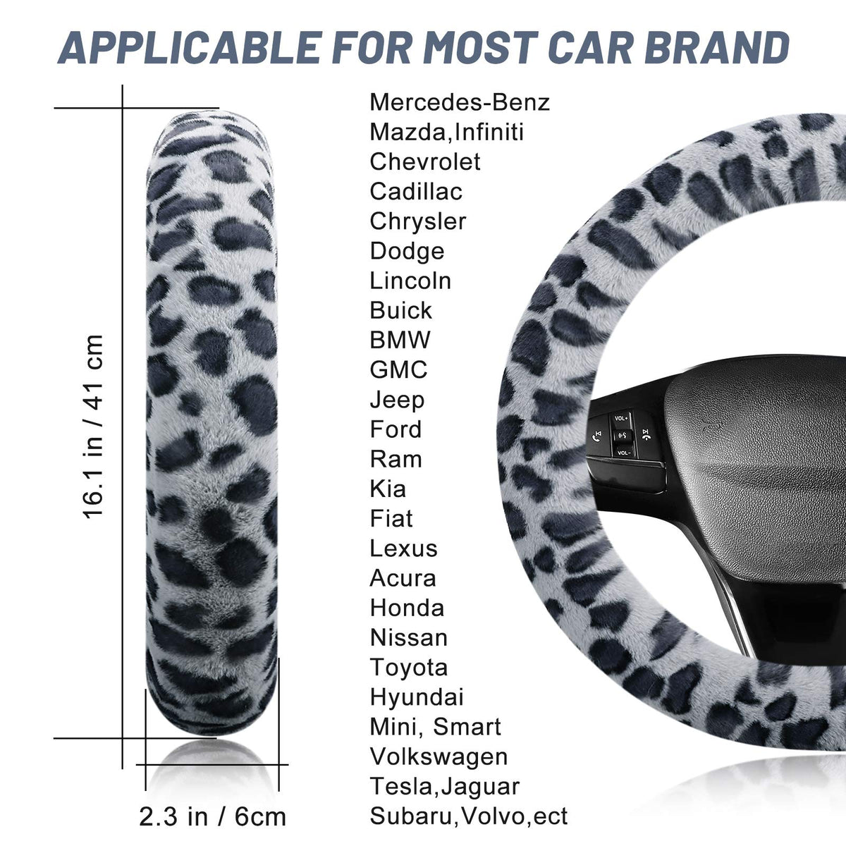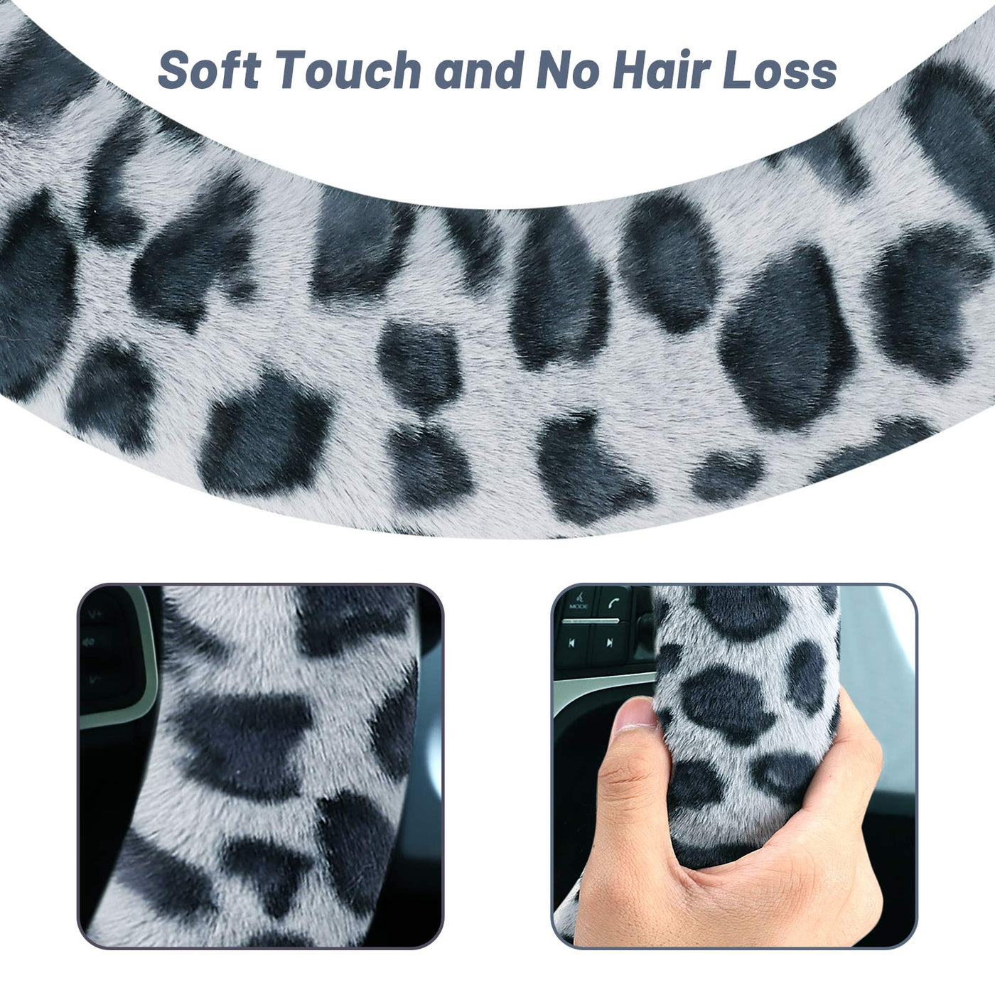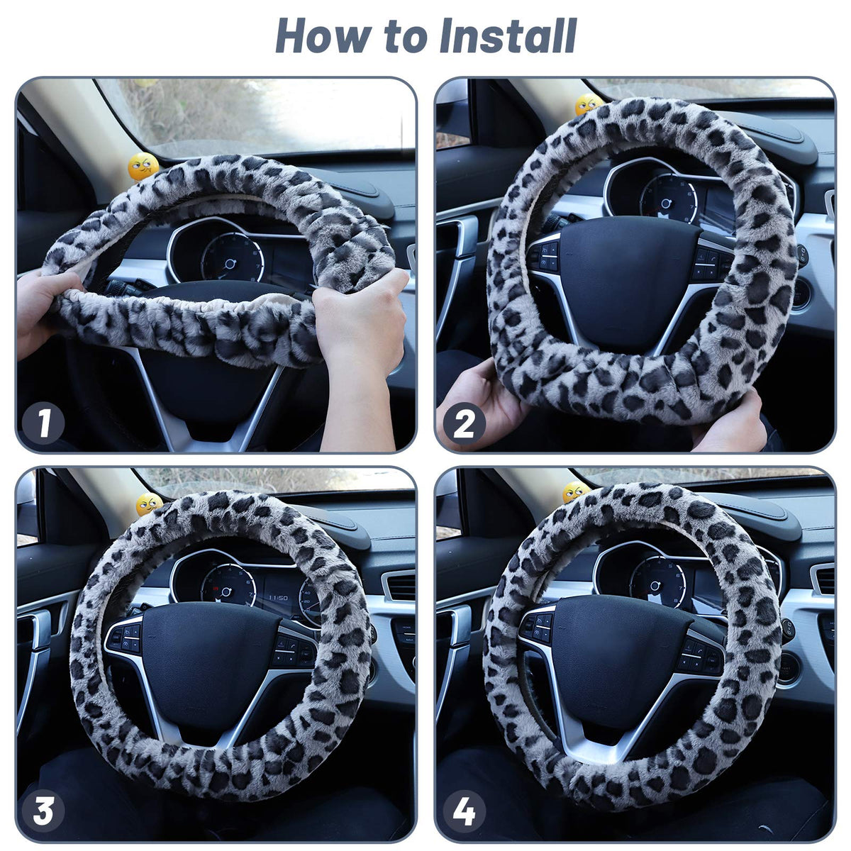 Why Choose Accmor Leopard Car Wheel Cover Set : - - Easy to install: Elastic Stretch-on install very easy to put on. - Warm beautiful and fashion! - Keep Dry, Anti-slip, cost-effective - Fits most standard steering wheels Installation instruction: - 1. Set the cover on the steering wheel; - 2. Then install it from the top to the bottom, you may need to force it for it is tight; - 3. Fasten the cover. Package Includes: - 1* Fluffy steering wheel cover (Gray) - 1* Handbrake Cover (Gray) - 1* Gear Shift Cover Set (Gray)