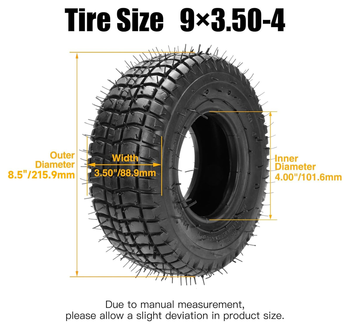 Fvrito 9X3.50-4 9X3-1/2 Tire And Inner Tube For Mini Atv Quad Go Kart Petrol Electric Gas Skateboard Scooter Mini Choppers Garden Lawnmower Tractor With Bent Valve Stem Compatible With Garden Lawnmower , 49Cc 2-Stroke Mini Atv, Mini Quad ,Mini Go Kart ,Petrol Electric Scooter , Mini Choppers,Gas Skateboard Scooter,Tractor The 9''X3-1/2'' Size Is Sometimes Referred To As The 9X3.50-4 Scooter Tire, These Are Very Common Scooter Tires And Are Used On A Wide Variety Of Scooter Tire Applications. Package Include:1 X Inner Tube,1 X Tire,1 X Red Stem Valve Caps,2 X Black Stem Valve Caps,1X Valve Core Wrench,2 X Brass Valve Stem Cores Tire Diameter:9'' / Tire With:3.50'' / Rim Diameter:4'' Please Check For The Details And Size To Make Sure This Part Will Fit.