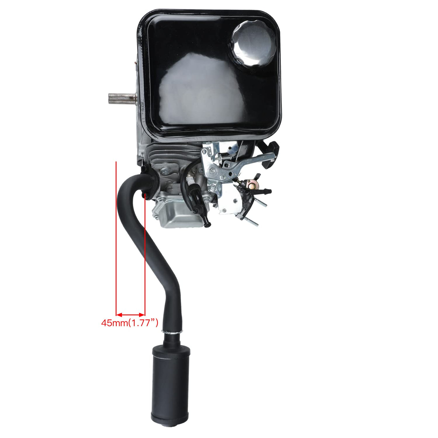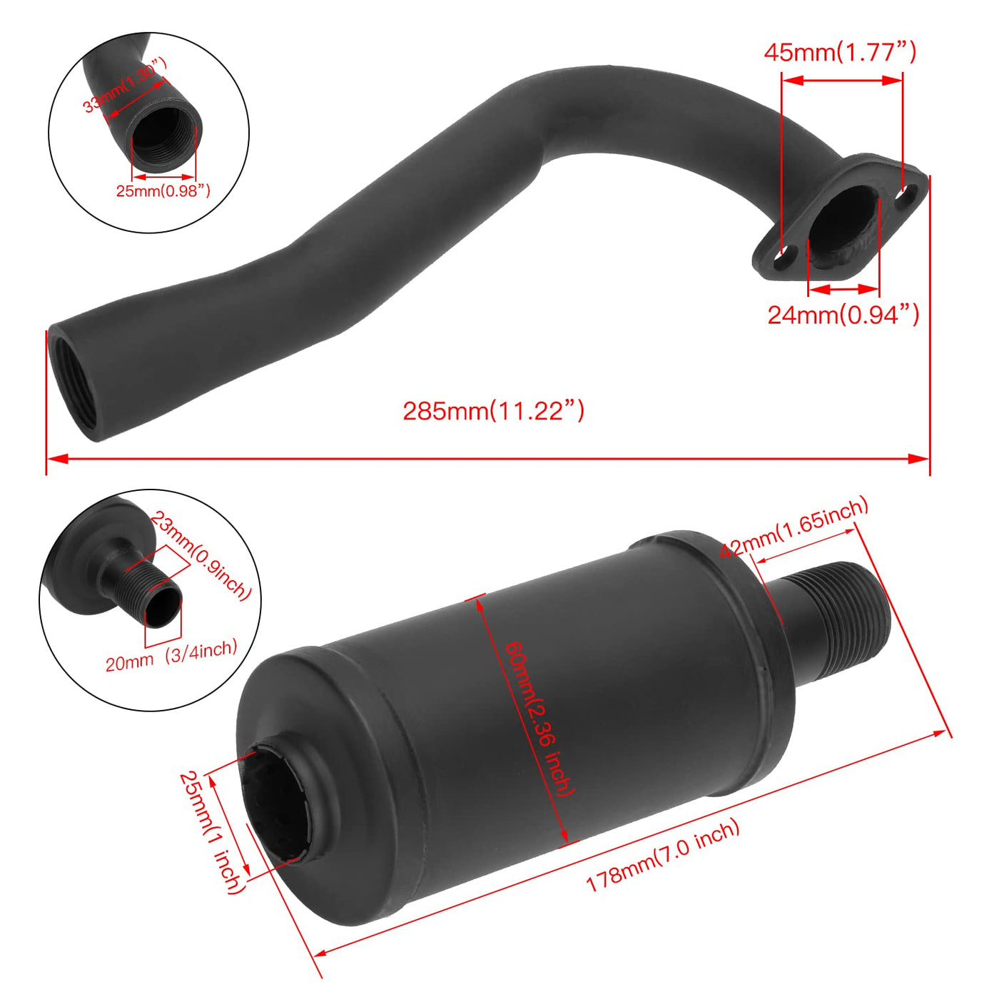 FVRITO Black Center Rear Exhaust Pipe with Muffler Replacement for 6.5HP Hemi Predator 212cc Tillotson GX160 GX200 OHV Clone Engine Go Kart Specification Product Name: 1''Center Rear Exhaust Muffler Kit Condition: Brand New Material: Metal Color:Black Size Exhaust: Bolt hole diameter: 9mm(0.35 inch) Mounting Hole Distance: 45mm(1.77 inch) Inner diameter:24mm(0.94 inch) Outside diameter:25mm(0.98 inch) Height from the bottom of the tip to the center of the holes:2.5mm(2 inch) Distance from the top of engine plate to the bottom of the header:258mm(10.16 inch) Muffler: Overall length: 178mm(7.0 inch) Inner diameter of pipe: 20mm(3/4 inch) Outside diameter of pipe: 25mm(1 inch) Thread length: 25mm(1 inch) (Manual measurement, please allow 1-3mm error) Fitment Fit for Predator 212cc,Powerhorse 208cc,DuroMa* 7Hp,Tillotson 212,BILT HARD 7HP 212cc Go Kart. Package include 1x Header pipe 1x Muffler 1 x Gasket 1 x Wrench 2 x Lock washer 2 x Screw Note The header pipe has a female thread on the tip,which can be screwed on 3/4 inch male muffler if needed.Tighten the screws during installation.Smooth surface without sanding.Check size and pictures carefully before purchasing.Please contact us by email if you have any questions.