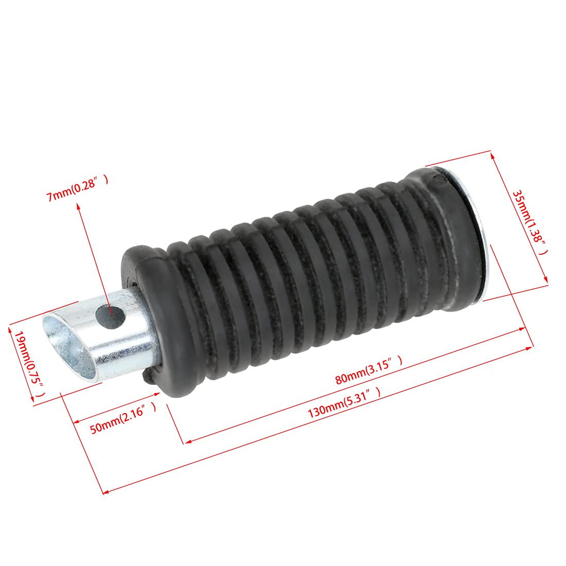 Q: What are the dimensions of the FVRITO Footpegs?A: The FVRITO Footpegs have an overall length of 130 mm (5.31 inches), a width of 35 mm (1.38 inches), and a bolt diameter of 19 mm (0.75 inches), making them suitable for various mini bike models.