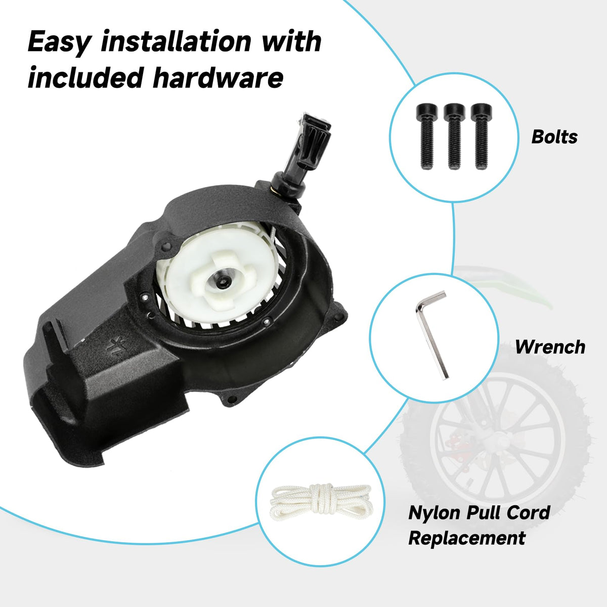 Q: How do I install the pull start recoil starter?A: Installation is straightforward and includes all necessary hardware. Simply mount it on the flywheel and secure it using the included bolts and wrench.