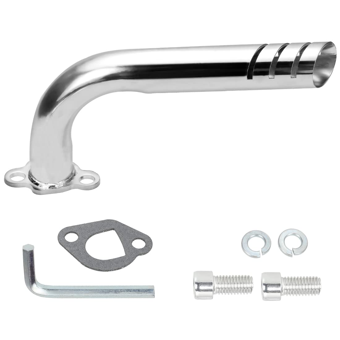 Q: What is included in the package when purchasing this exhaust pipe kit?A: The package includes one exhaust pipe, one gasket, one wrench, two lock washers, and two screws, providing you with everything you need for installation right out of the box.