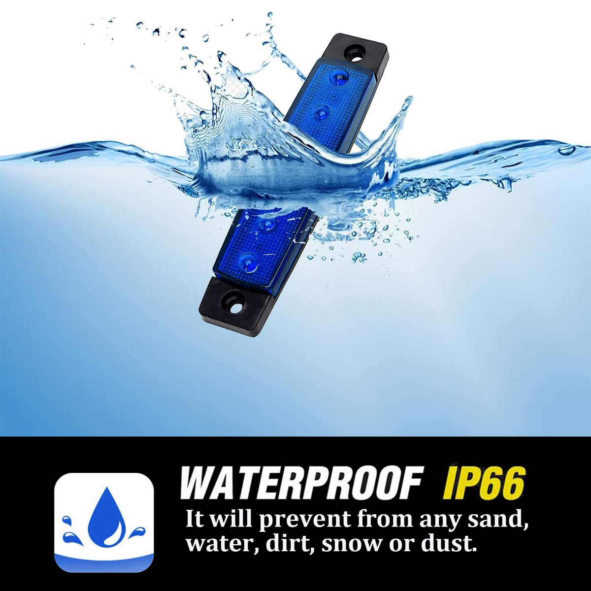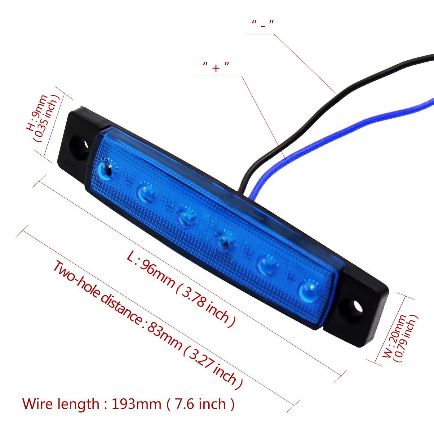 High Quality, Low Power Consumption Easy To Install, Long-Lasting And Durable Waterproof, Reliable And Safe Fits For Most Buses/Trucks/Trailers/Lorries, Please Make Sure The Size Before Purchasing. These Can Be Used For Side Marker Lights, Rear Lights, Etc. Material: Abs Color: Black + Blue Size: 95 X 20 X 8 Mm Holes Spacer: 8.3 Cm Lead Cable Length: About 28 Cm Light Color: Blue Led Quantity: 6 X Light Emitting Diodes Voltage: Dc 12V Suitable For Most Of Buses, Trucks, Trailers, And Lorries Package Included 10 X Side Marker Lights 20 X Screws