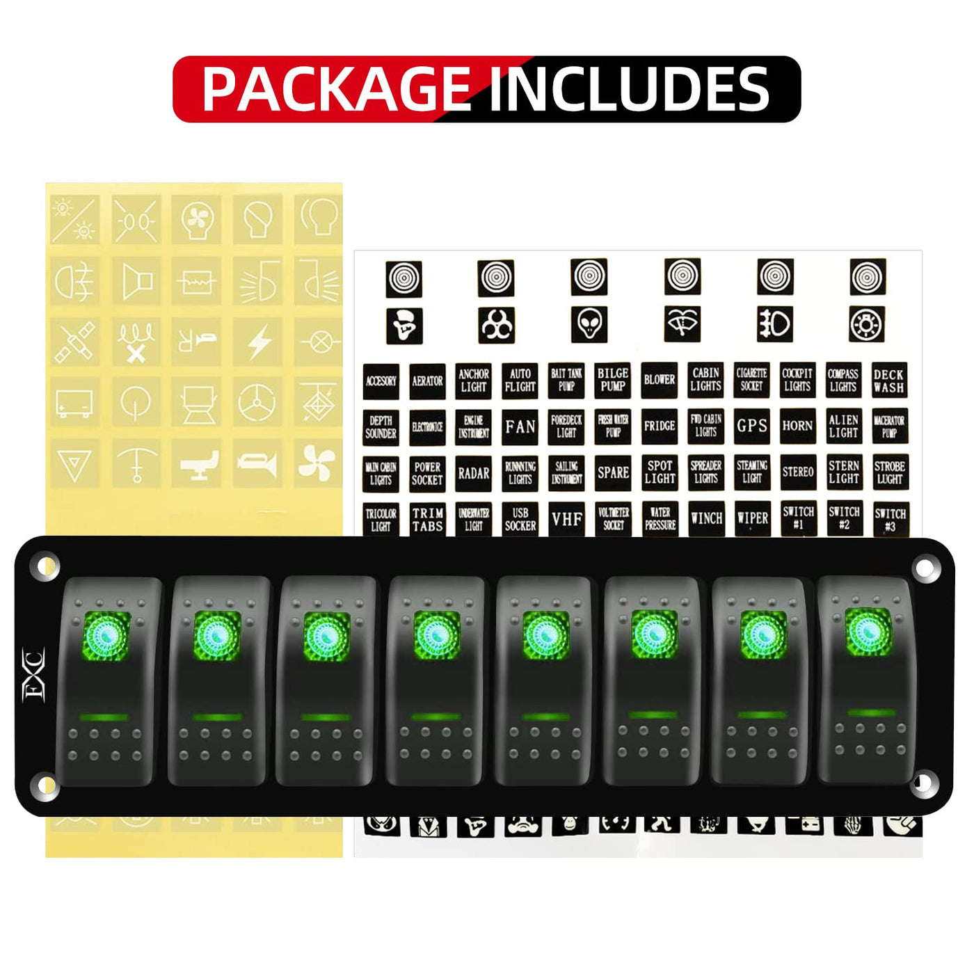 Fxc Green 8 Gang Rocker Switch Aluminum Panel Toggle Dash On/Off Pre-Wired Switches Panel Waterproof For 12V/24V Automotive Cars