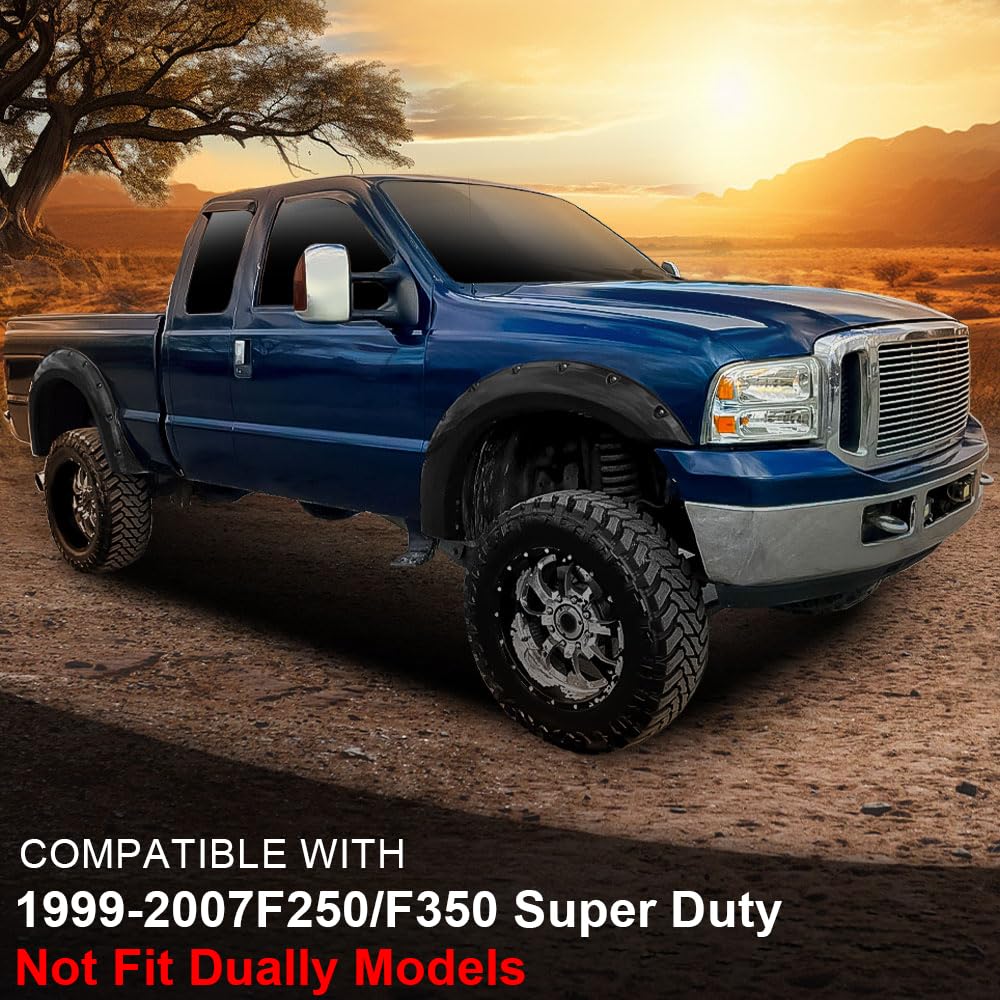 Title: Fender Flares Pocket Application: Compatible With Ford F250/F350 1999-2007 Super Duty Compatible Withstyle Side Only, Does Not Compatible With Dual Rear Wheel Model Color: Textured Black Specifics And Benefits: Brand New In Original Box, Never Been Tried On & Used Comes With 1 Set Of 4 Pieces Fender Flare (2 For Front And 2 For Rear) Hardware For Installation Are Included High Quality Injection Moulding Fender Flares With Textured And Precise Edge Cutting Finish To Protect Wheel From Mud, Scratches, Sand And Other Outer Damage Gives Your Vehicle Upgrade, Refresh Look No Cutting Or Trimming Needed; Some Drilling May Be Required Factory Mud Flaps Must Be Remove If Equipped Professional Installation Is Highly Recommended Package Includes: A Set(4Pcs) Of Pocket Style Fender Flares Necessary Mounting Hardware