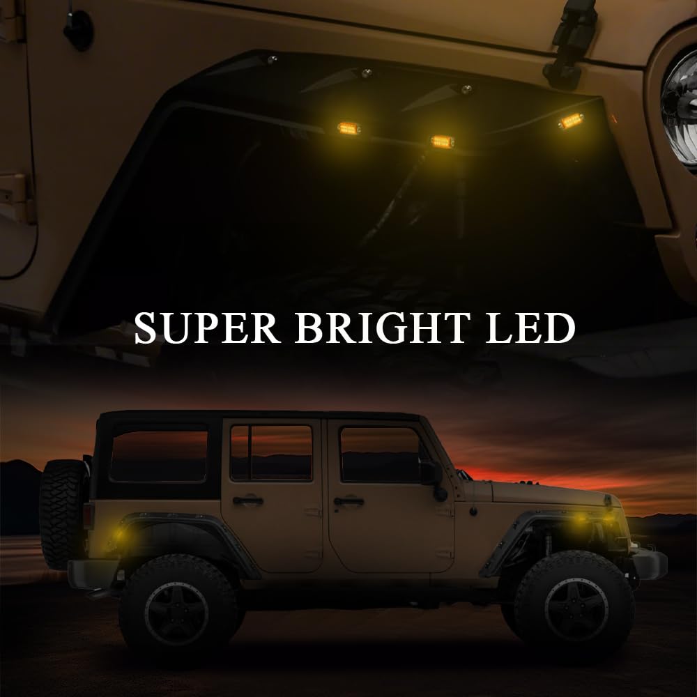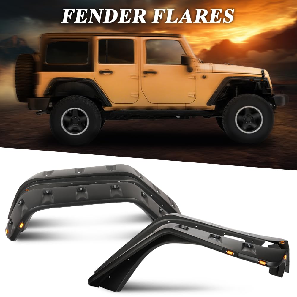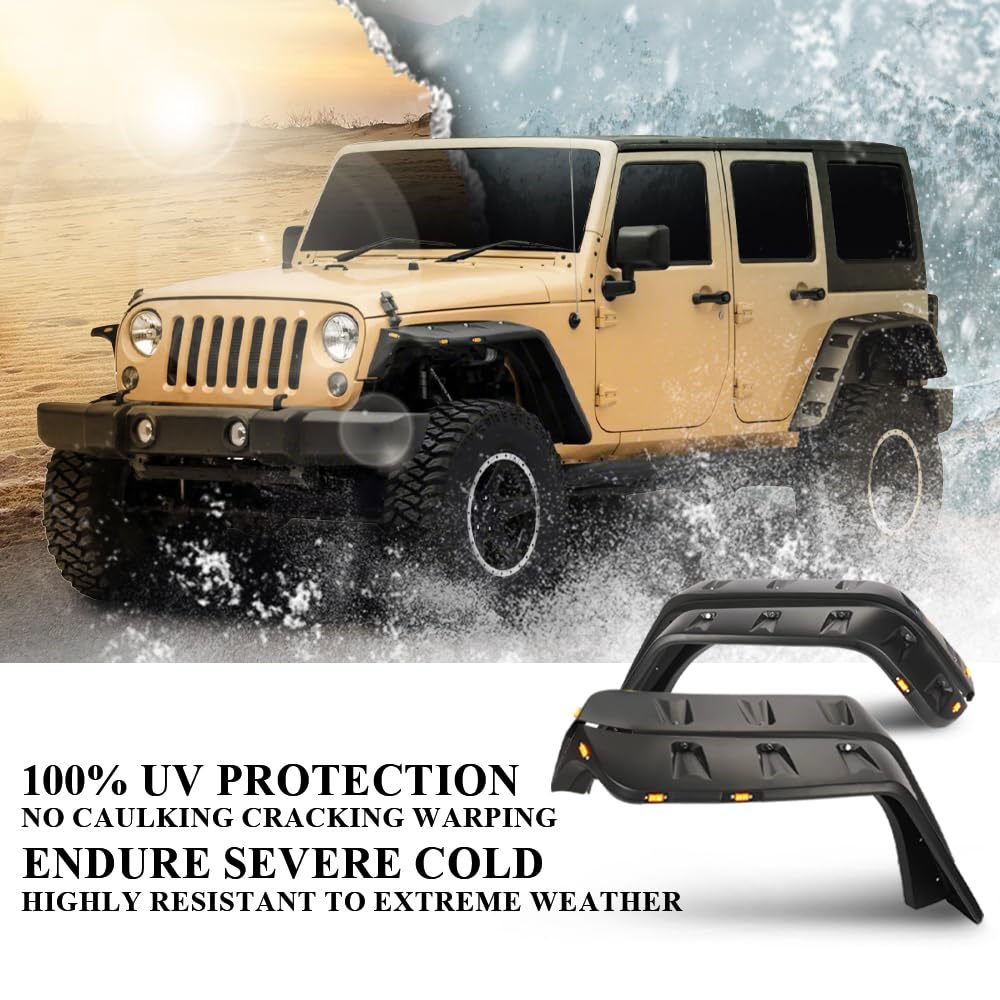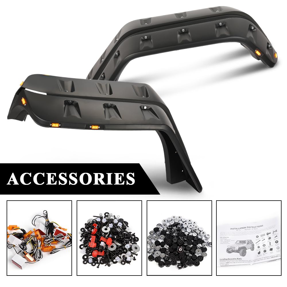 Fender Flares with LED Light Side Maker, Compatible with Jeep JK Wrangler 2/4 Door Model 2007-2018, Unlimited, Rubicon Unlimited, Pocket Rivet Style Smooth Black 4pcs