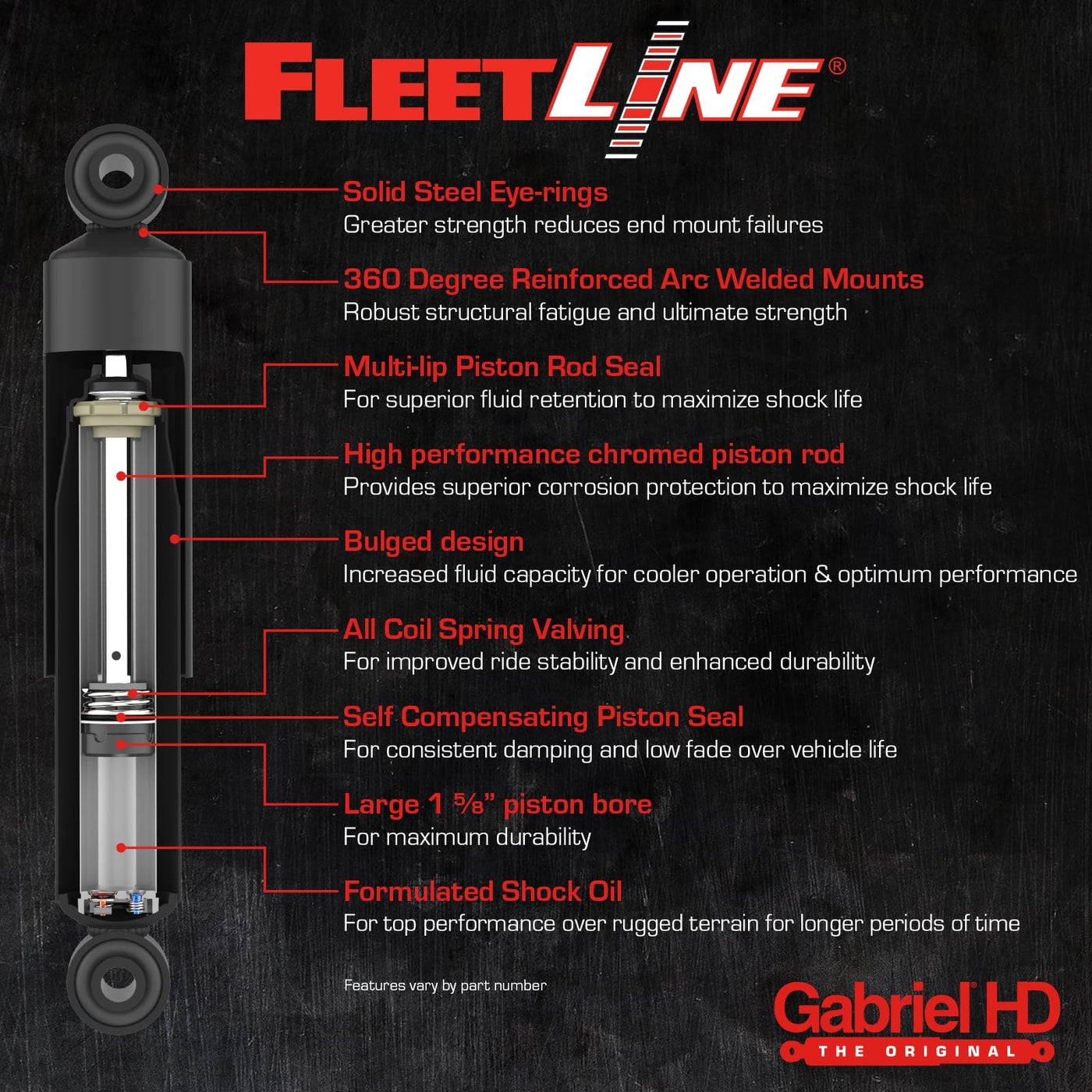 Gabriel Fleetline - Commercial Shocks Absorbers | Premium Heavy Duty Shock Absorbers For Trucks, Trailers And Buses (Heavy Duty & Commercial Vehicles)About Gabrielfor Over 100 Years, Gabriel Has Been At The Forefront Of Suspension Technology, Providing Reliable And Durable Ride Control Solutions. Gabriel Fleetline Shocks Are Engineered Specifically For Heavy-Duty Commercial Vehicles And Fleet Operations, Delivering Unmatched Durability And Performanceproduct Detailsfleetline Shocks - Commercial Truck And Trailer Shocks (83000 Series) - Designed As A Direct Replacement For The Original Equipment Shock, Fleetline Shock Absorbers By Gabriel Provide A Valving Rate That Compensates For Initial Truck Suspension Softening, Providing Performance That Better Matches The Original Ride. Built With Original Equipment Quality Components And 10 Stage Valving To Ensure Superior Performance Throughout The Life Of The Shock, It Also Reduces Wear And Tear On Other Costly Suspension And Vehicle Parts. And Like All Gabriel Shocks And Struts, Fleetline Shocks Feature A Super-Finished Chrome Piston Rod For Superior Corrosion Resistance And A Leak-Proof Piston Seal Which Extends Product Life. Unique Pressurized Piston Seal Design Reduces Force Velocity Variabilities And Self-Compensates For Wear. A Hydraulic Rebound Stop, Where Required, Prevents Shocks From Topping Out And Suspensions From Overextendingproduct Features Durable, Self-Compensating Piston Seal Design For Consistent Damping Throughout The Shock Life 1 3/8 Bore Designed For Classes 3-6 Vehicles And Heavy Truck Suspensions Formulated Shock Oil For Exceptional Anti-Fade Performance Solid Steel Eye Rings & 360 Arc-Welded End Mounts Deliver Tough Tensile Strength That Reduces End Mount Failures Heavy Duty Shock Absorbers For Trucks, Trailers And Buses Anti-Corrosion End Mounts To Inhibit Rust & Corrosion Chromed Piston Rod To Inhibit Corrosion, Ensure Proper Seal Lubrication And Provide A More Consistent Wear Surface Formulated Shock Oil For Exceptional Anti-Fade Performanceinstallationprofessional Installation Is Recommended For Commercial Fleet Vehicles To Ensure Proper Fit And Performance. Follow Oem Installation Proceduresvehicle Fitmentfits Heavy-Duty Trucks, Buses, And Commercial Fleet Vehicles.Please Use The Confirmed Fit Tool To Ensure This Part Fits Your Vehicle