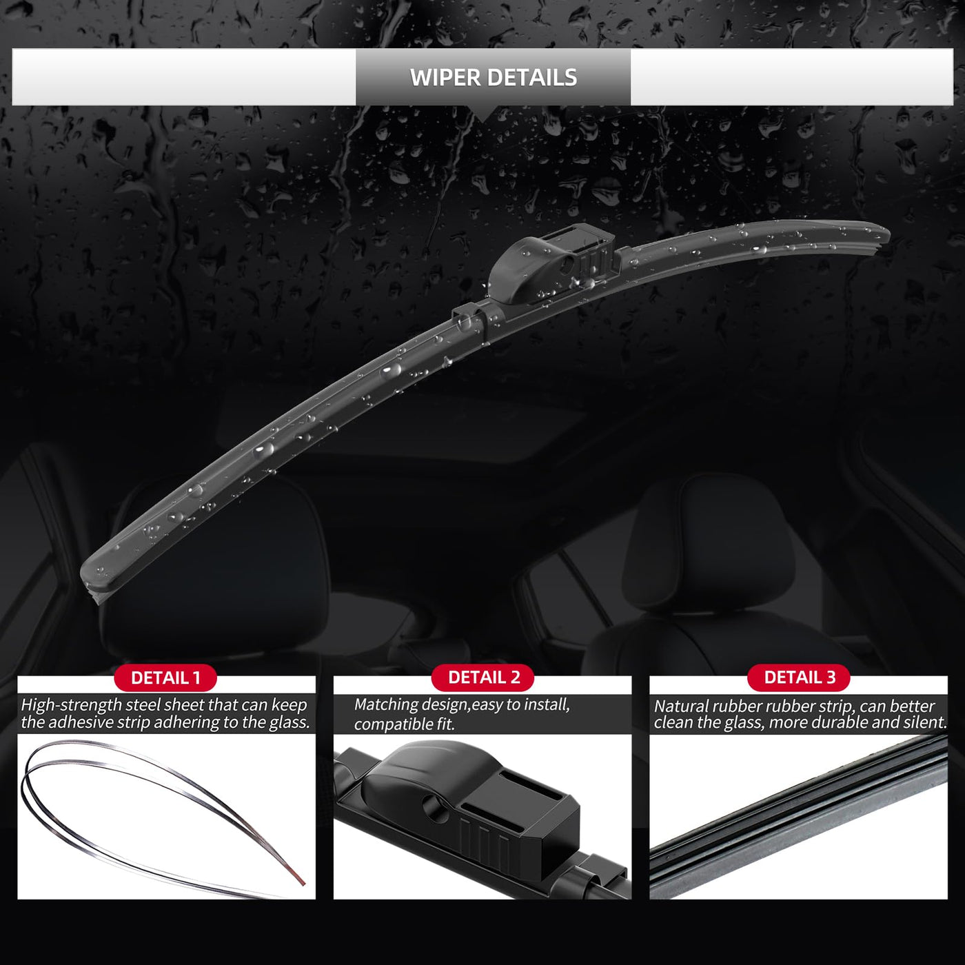 Q: How do these wiper blades perform in adverse weather conditions?A: The GARDIMU wiper blades are engineered with a specific beam curvature and dual precision-tensioned steel springs, providing uniform pressure along the entire blade length for exceptional visibility in rain, snow, and other adverse weather.