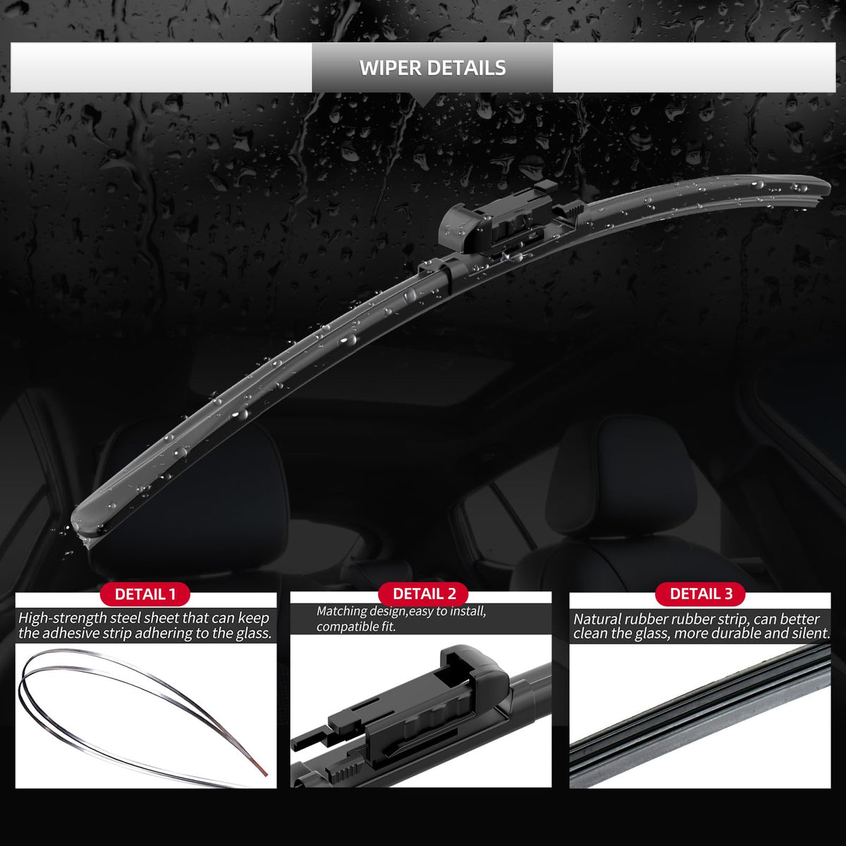 Q: How do these wiper blades perform in adverse weather conditions?A: The GARDIMU wiper blades utilize dual precision-tensioned steel springs that apply uniform pressure along the entire blade length. This design delivers crystal-clear visibility, making them reliable in rain, snow, and other challenging weather conditions.