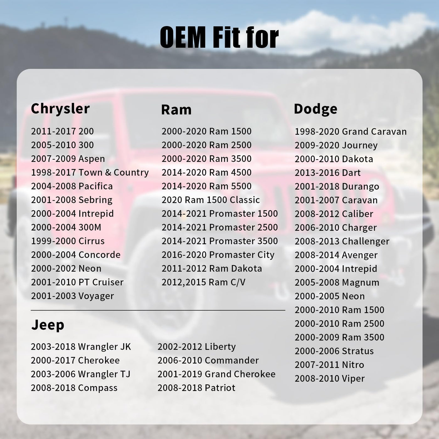 Important Note: Check The Part Number Before Your Order, It Saves You The Time Of Buying Back And Forth, And Also Helps You Save Money. Part Number: 52100552Ag, 52030387Ab, 52030387Aa Compatible With Jeep Vehicles: 2006-2010 Commander 2000-2001, 2014-2017 Cherokee 2008-2018 Compass 2001-2019 Grand Cherokee 2002-2012 Liberty 2008-2017 Patriot 2003-2018 Wrangler Jk 2003-2006 Wrangler Tj Compatible With Chrysler Vehicles: 2015-2017 200 2005-2010 300 2001-2004 300M 2007-2009 Aspen 1999-2000 Cirrus 2000-2004 Concorde 2000-2004 Intrepid 2000-2002 Neon 2004-2008 Pacifica 2001-2010 Pt Cruiser 2001-2008 Sebring 2001-2016 Town & Country 2001-2003 Voyager Compatible With Dodge Vehicles: 2008 Avenger - Exc J Eng Code 2008-2012 Caliber 2001-2007 Caravan 2008-2010 Challenger 2006-2010 Charger 2000-2010 Dakota 2013-2016 Dart 2001-2018 Durango 2000-2010 Dodge Ram 1500, 2500 2000-2009 Dodge Ram 3500 2001-2020 Grand Caravan 2000-2004 Intrepid 2009-2020 Journey 2005-2008 Magnum 2000-2005 Neon 2007-2011 Nitro 2000-2006 Stratus 2008-2010 Viper Compatible With Ram Vehicles: 2011-2019 Ram 1500 2011-2020 Ram 2500, 3500 2012, 2015 Ram C/V 2011 Ram Dakota 2014-2016 Ram Promaster 1500, 2500, 3500 Compatible With Plymouth Vehicles: 2000-2001 Neon Replacement Or Refund When Gas Cap Fails, Cracks, Stops Working Or Any Other Problems. 12 Months Worry-Free & 12-Hour Response Friendly Customer Service.
