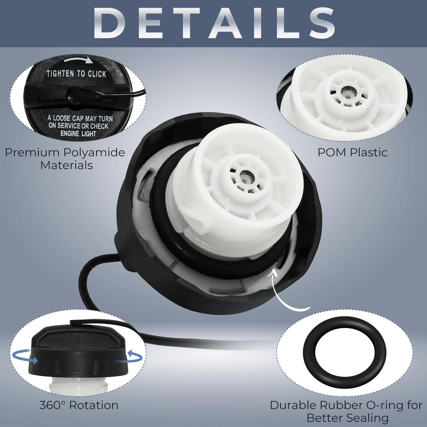Q: What materials is the gas cap made of?A: The gas cap is made of high-quality Acrylonitrile Butadiene Styrene (ABS), ensuring durability and reliability for long-term use.