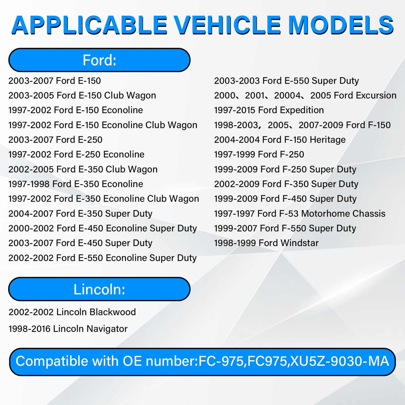 Gas Cap Fuel Cap Replacement Fuel Tank Caps Replace Part #: FC975, XU5Z-9030-MA, XU5Z9030MA Gas Cap Replacement Compatible with 2003-2007 Ford E-150,2003-2005 Ford E-150 Club Wagon,1997-2002 Ford E-150 Econoline,1997-2002 Ford E-150 Econoline Club Wagon,2003-2007 Ford E-250, 1997-2002 Ford E-250 Econoline, 2002-2005 Ford E-350 Club Wagon, 1997-1998 Ford E-350 Econoline, 1997-2002 Ford E-350 Econoline Club Wagon, 2004-2007 Ford E-350 Super Duty, 2000-2002 Ford E-450 Econoline Super Duty, 2003-2007 Ford E-450 Super Duty, 2002-2002 Ford E-550 Econoline Super Duty. Gas Cap Replacement Compatible with 2003-2003 Ford E-550 Super Duty, 1997-2015 Ford Expedition, 1997-2015 Ford Expedition, 1998-2003,2005?2007-2009 Ford F-150, 2004-2004 Ford F-150 Heritage, 1997-1999 Ford F-250, 1999-2009 Ford F-250 Super Duty, 2002-2009 Ford F-350 Super Duty, 1999-2009 Ford F-450 Super Duty, 1997-1997 Ford F-53 Motorhome Chassis, 1999-2007 Ford F-550 Super Duty, 1998-1999 Ford Windstar, 2000?2001?20004?2005 Ford Excursion Gas Cap Replacement Compatible with 2002-2002 Lincoln Blackwood, 1998-2016 Lincoln Navigator