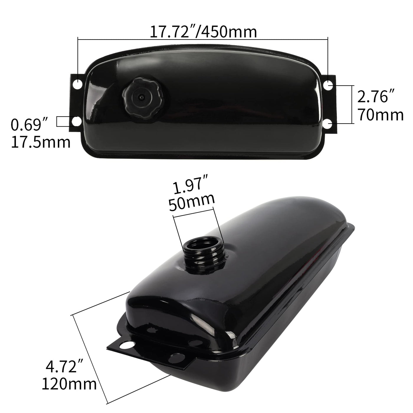 Q: What are the dimensions of the gas fuel tank?A: The gas fuel tank features the following dimensions: front to back hole spacing of 17.72 inches (450 mm), side to side hole spacing of 2.76 inches (70 mm), height of 4.72 inches (120 mm), and a hole diameter of 0.69 inches (17.5 mm). This size is designed to meet the needs of many go-kart models within the specified range.