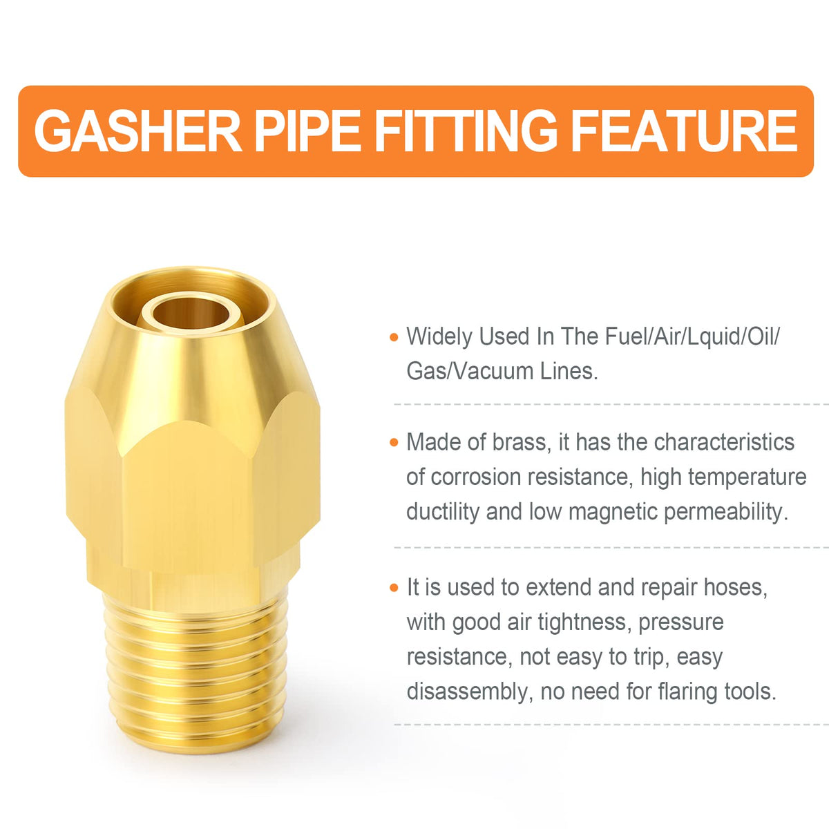 Q: What are the main features of the GASHER Brass Pneumatic Replacement Fitting?A: The GASHER Brass Pneumatic Replacement Fitting is made of high-quality brass, offering corrosion resistance, high temperature ductility, and low magnetic permeability. It provides good air tightness and pressure resistance, is easy to disassemble without flaring tools, and is suitable for a wide range of applications including fuel, air, liquid, oil, gas, and vacuum lines.