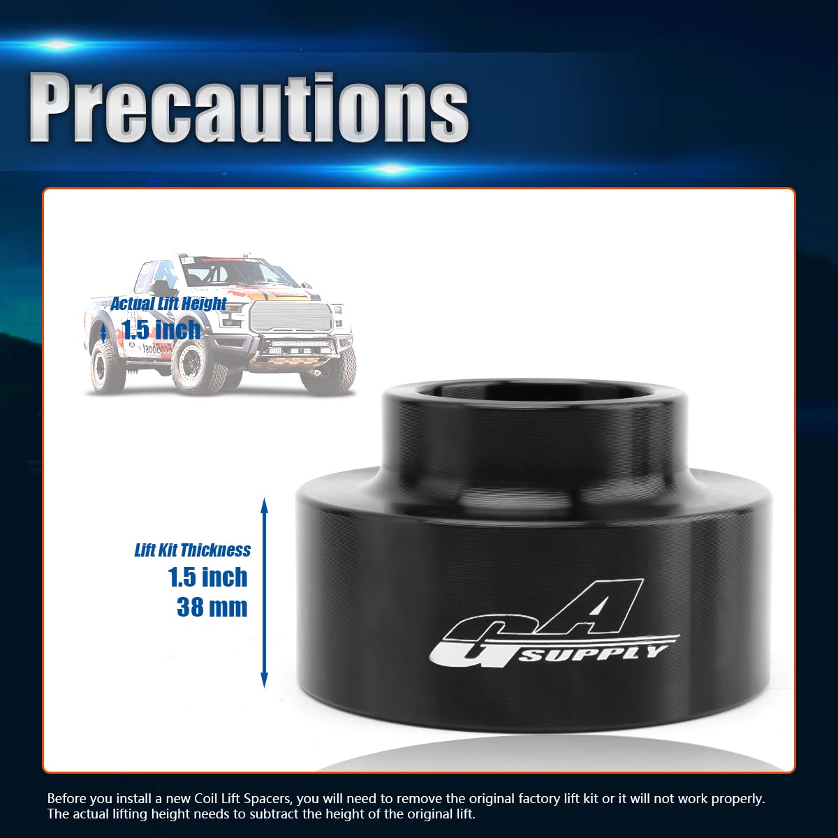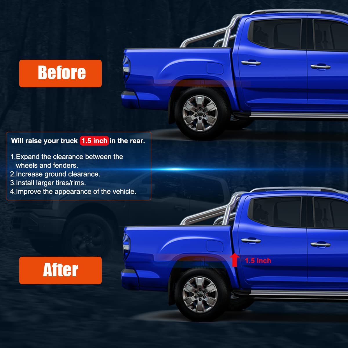 Fitment Compatible with 2009-2024 Dodge Ram 1500 2WD 4WD Does Not Fit Factory Air Ride equipped trucks and Mega Cab Models IMPORTANT NOTES The leveling lift kit will lift the rear of the truck 1.5 inch, but the lifting kit is not 1.5 inch thick.Due to the geometry of the suspension,The ratio of vehicle lift height to lift kit thickness is not 1:1. The lift kit does not include the thickness of the original factory lift kit. Before you install a new Coil Lift Spacer, you will need to remove the original factory leveling kit or it will not work properly Contents 2 1.5 inch Rear Coil Spacers Benefits Increase the gap between the wheel and the fender, and get more ground clearance, make the vehicle look more aggressive, to get the best performance. You can install larger and wider tires/rims Safety Our Lift Block Kit is precision machined using the latest in metal fabrication technology. And passed ISO 9001 certification, and meets the highest quality control standards Manufactured from 6061-T6 aluminum billet,Safer and more reliable Installation Instructions Easy installation, no need to modify or replace any factory parts, can be completed within 1-2 hours