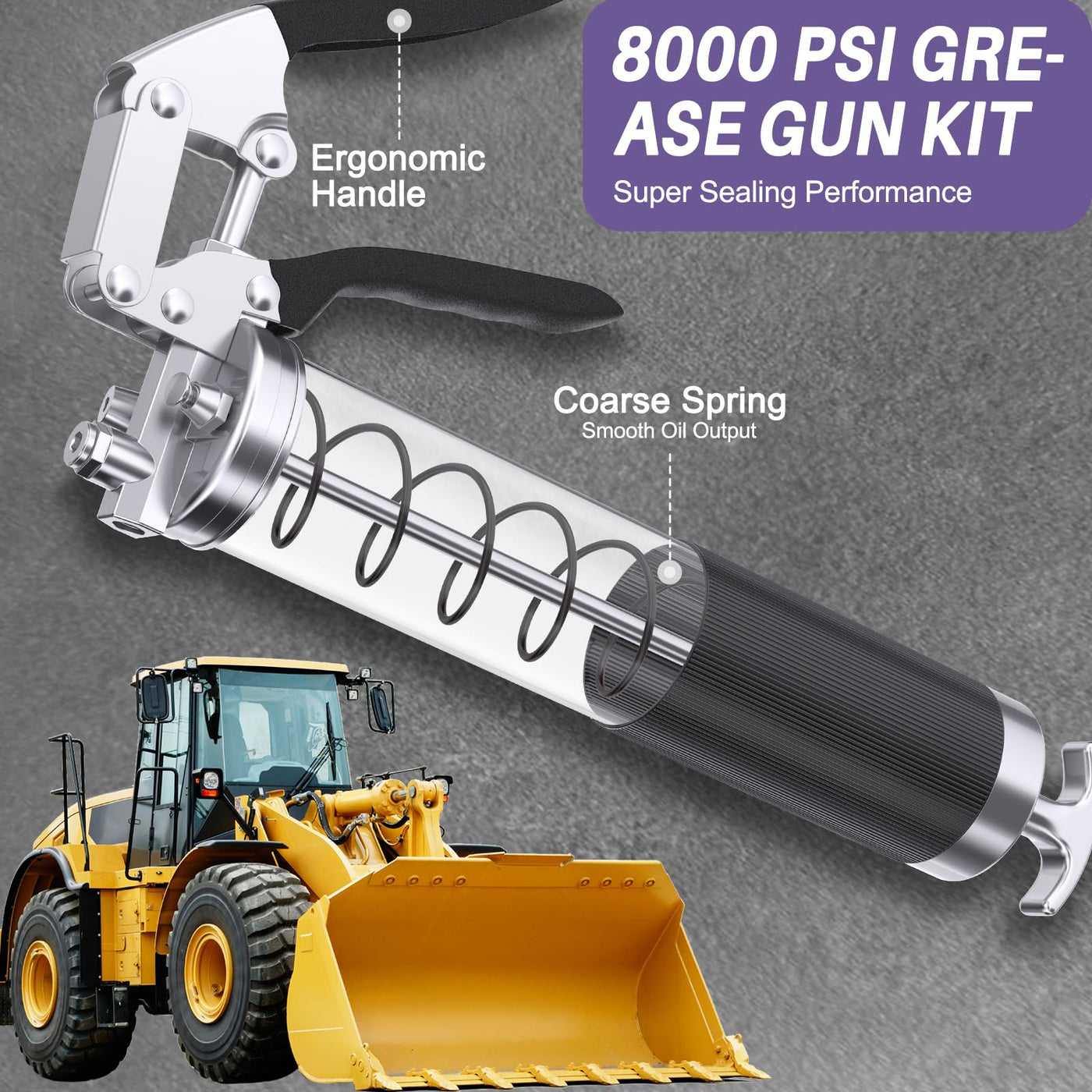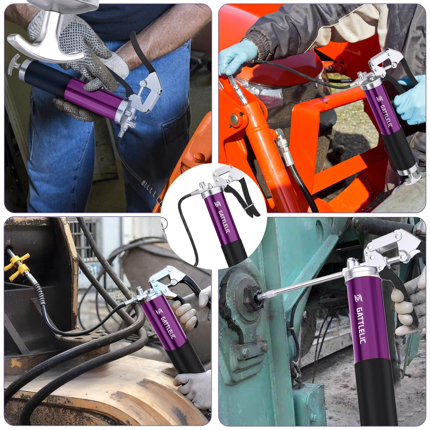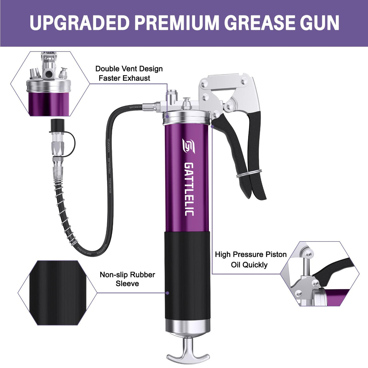 GATTLELIC 8000 PSI Heavy Duty Grease Gun Kit - 14oz with Flex Hose, Sharp Nozzle, Extension Pipe & Coupler, Purple