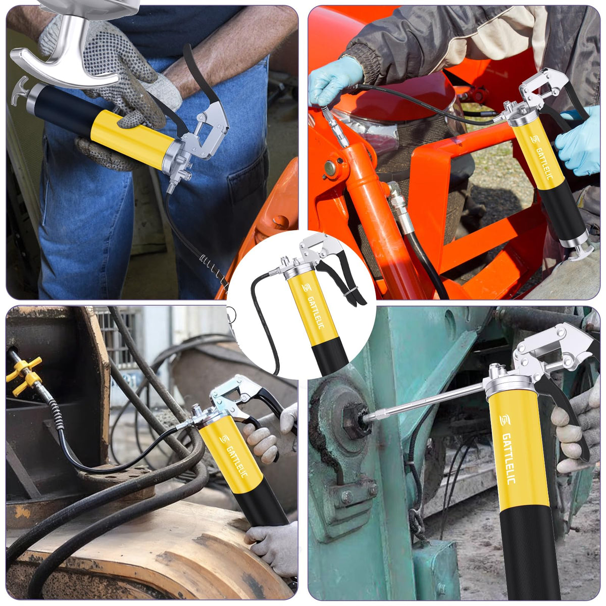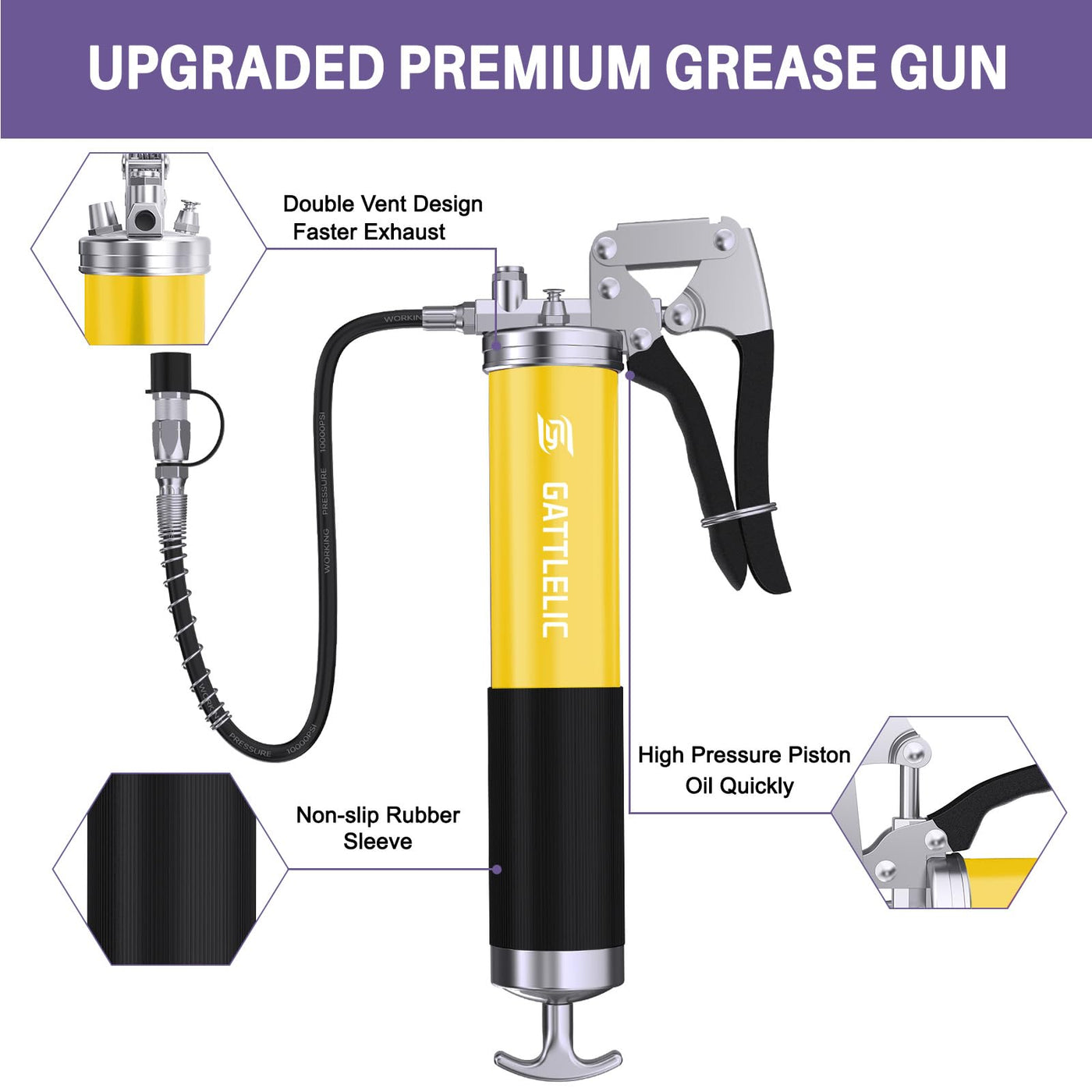 GATTLELIC 8000 PSI Heavy Duty Grease Gun Kit - 14oz with Flex Hose, Sharp Nozzle, Extension Pipe & Coupler, Yellow