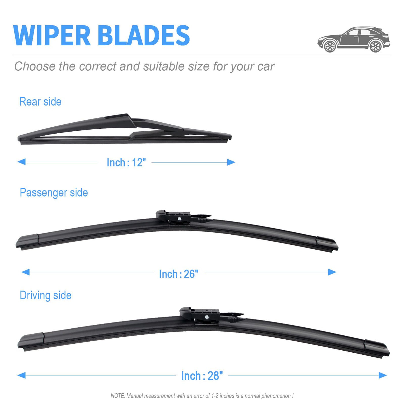 Q: What is included with the purchase of the Gavimnal® wiper blades?A: With your purchase, you will receive a set of three wiper blades: a 28-inch driver's side blade, a 26-inch passenger side blade, and a 12-inch rear wiper blade, all backed by a 6-month product warranty.