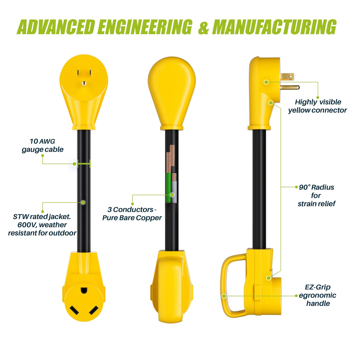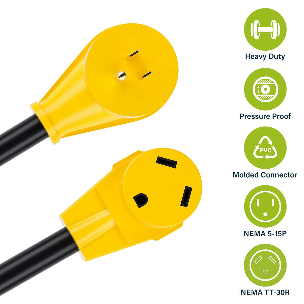 Q: How do I properly maintain the RV adapter cord for longevity?A: To maintain the RV adapter cord, store it in a dry place when not in use, avoid sharp bends, and periodically inspect it for wear or damage to ensure optimal performance.