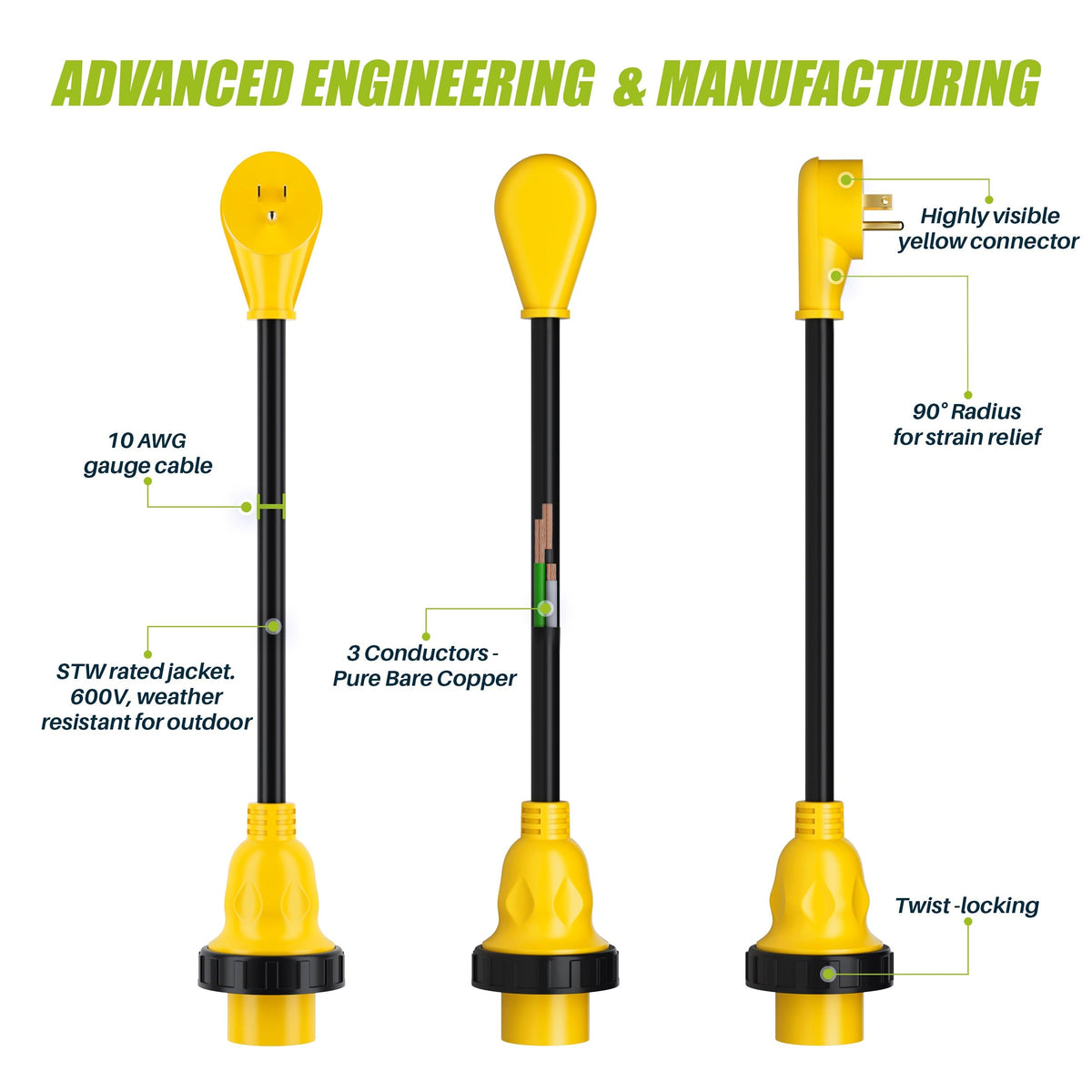HEAVY DUTY & DURABLE MATERIALS - 15AMP (NEMA 5-15P) male to 30AMP (NEMA L5-30R) locking female | STW indoor/outdoor water resistant jacket | ETL listed SUPERIOR SPECIFICATIONS - 125 Volts and 3750 Watts | 10AWG American Gauge Wire | 100% copper wiring | 3 conductors WEATHERPROOF LOCKING PLUG - NEMA L5-30R locking connector with threaded ring help protect against any weather element 90 DEGREE BEND RELIEVE - Maintain flexibility and reduce pressure on the cord LIMITED LIFETIME REPLACEMENT WARRANTY + 30-DAY, 100% MONEY-BACK GUARANTEE - We are committed to our customers' satisfaction, which is why we offer a Limited Lifetime Replacement Warranty and a 30-Day, 100% Money-Back Guarantee. If you're not completely satisfied, simply contact us directly, within 30 days of purchase, for a full refund!