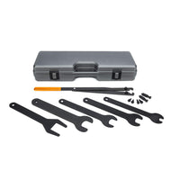 A Universal 35W Pulley Holder; A Small Pin Set (5-By-8Mm); A Large Pin Set (Cam Pins, 6-By-10Mm, And 7-1/2-By-18Mm); A 22-Mm Fan Nut Wrench (7/8-Inch); A 36-Mm Fan Nut Wrench (1-7/16-Inches); A 40-Mm Fan Nut Wrench (1-9/16-Inches); A 47-Mm Fan Nut Wrench (1-7/8-Inches); And A 50-Mm Fan Nut Wrench (2-Inches) And Blow-Molded Case.