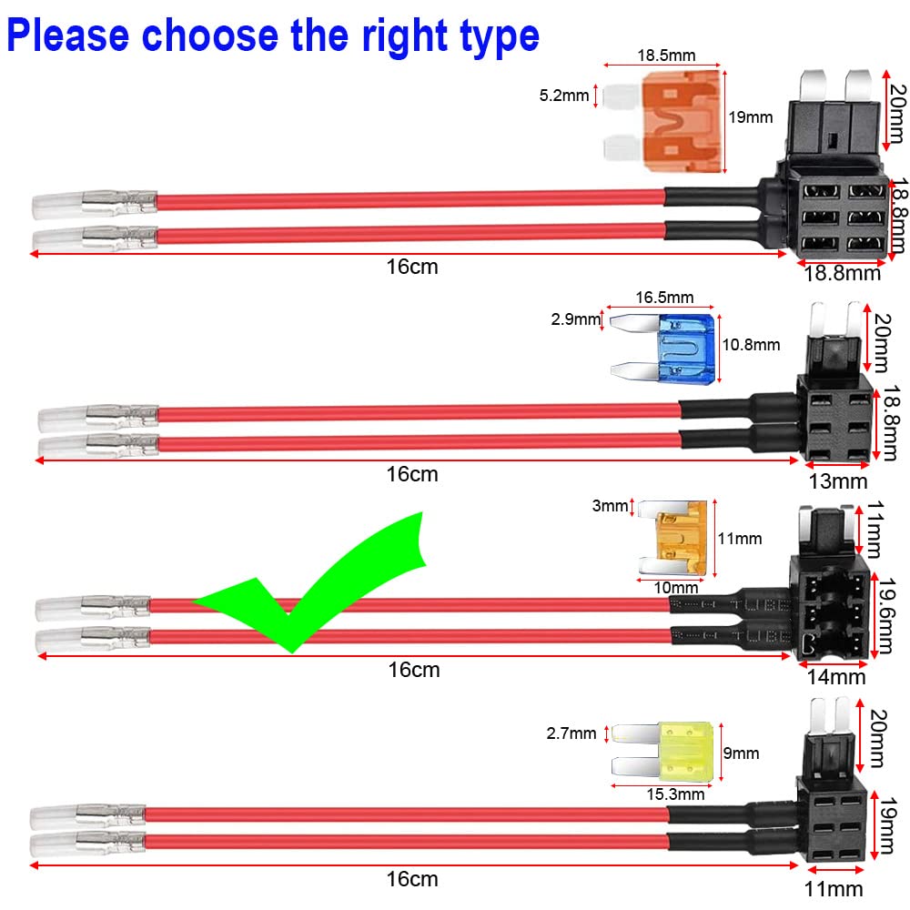 Package contents: 2 Dual-port Fuse holder with accessories 2 5A Mini blade fuse 2 10A Mini blade fuse 1 Fuse puller Size: Total length: about 17.5cm/ 6.89in Cable length: 16cm/ 6.3in Easy Installation: 1. Simply remove an existing fuse from the fuse box, insert that fuse in to the bottom slot of the fuse tap. 2. Insert a suitable fuse for the new accessory in to the top slot. 3. Crimp your new live wire to the transparent butt terminal on the fuse tap.