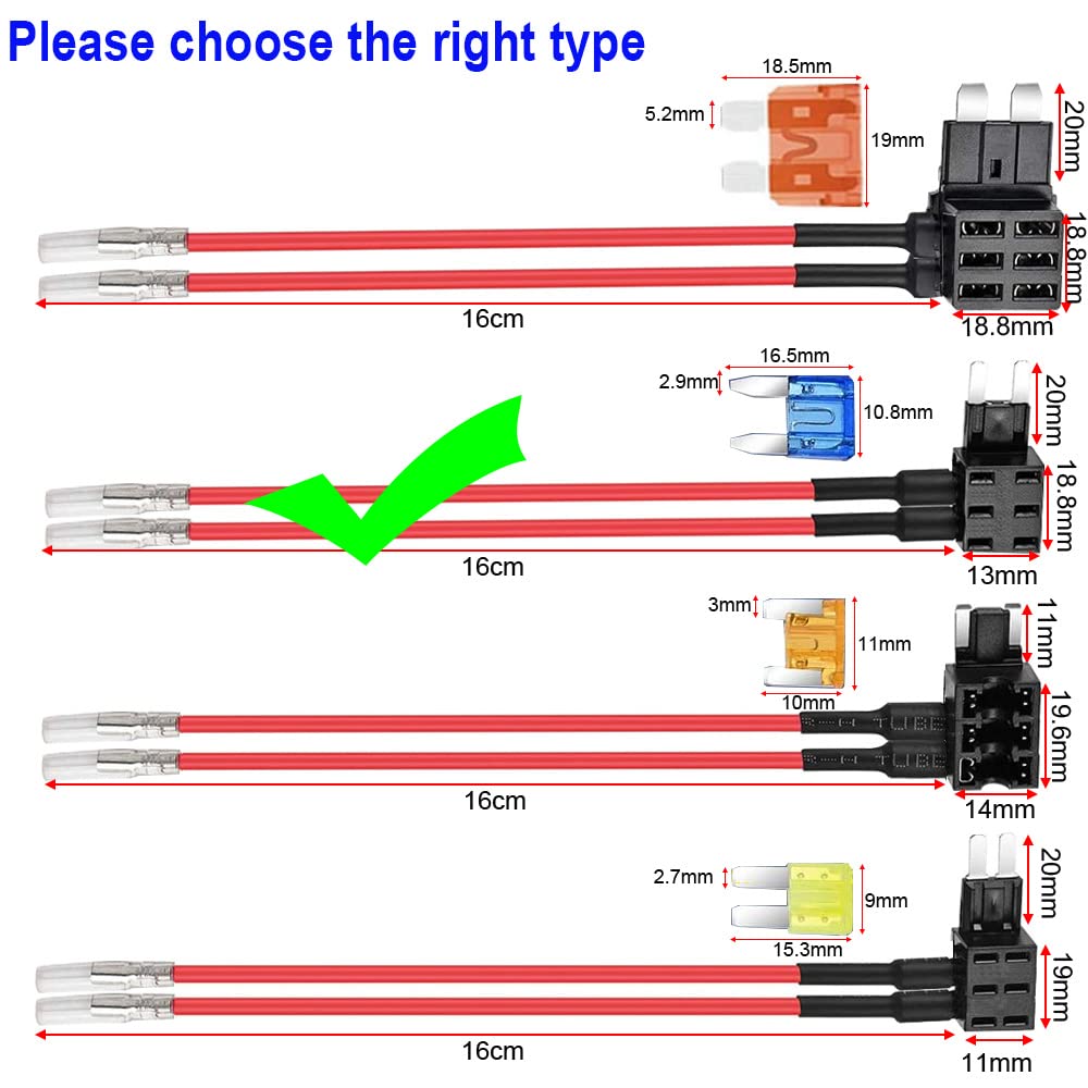Package contents: 2 Dual-port Fuse holder with accessories 2 5A Small blade fuse 2 10A Small blade fuse 1 Fuse puller Size: Total length: about 17.5cm/ 6.89in Cable length: 16cm/ 6.3in Easy Installation: 1. Simply remove an existing fuse from the fuse box, insert that fuse in to the bottom slot of the fuse tap. 2. Insert a suitable fuse for the new accessory in to the top slot. 3. Crimp your new live wire to the transparent butt terminal on the fuse tap.
