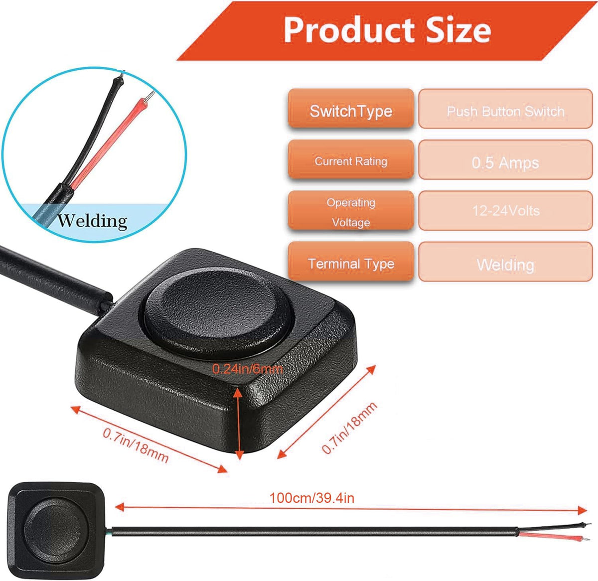 The operation type of this product is momentary switch, keep holding down the button to turn on the switch, hand off the button to turn off the switch | This 12-24v switch has a compact design, only18*18*8mm, wire length 100cm | Momentary pushbutton switch with strong double-sided adhesive on the back, can be fixed in any position as needed, easy to install | Package: 4 Pcs Momentary Push Button Switch | Ideal for 12V-24V inputs, doorbells, some types of alarms, reset buttons, push to start devices, or any situation where short, controlled low current activity is required