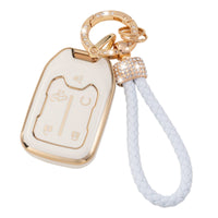 Q: What additional items are included with the key fob cover?A: The Gematay key fob cover comes with a stylish keychain accessories set that includes an anti-lost D-buckle, a shiny metal clip with two rings, a hand-made woven lanyard, and a screwdriver for easy installation.