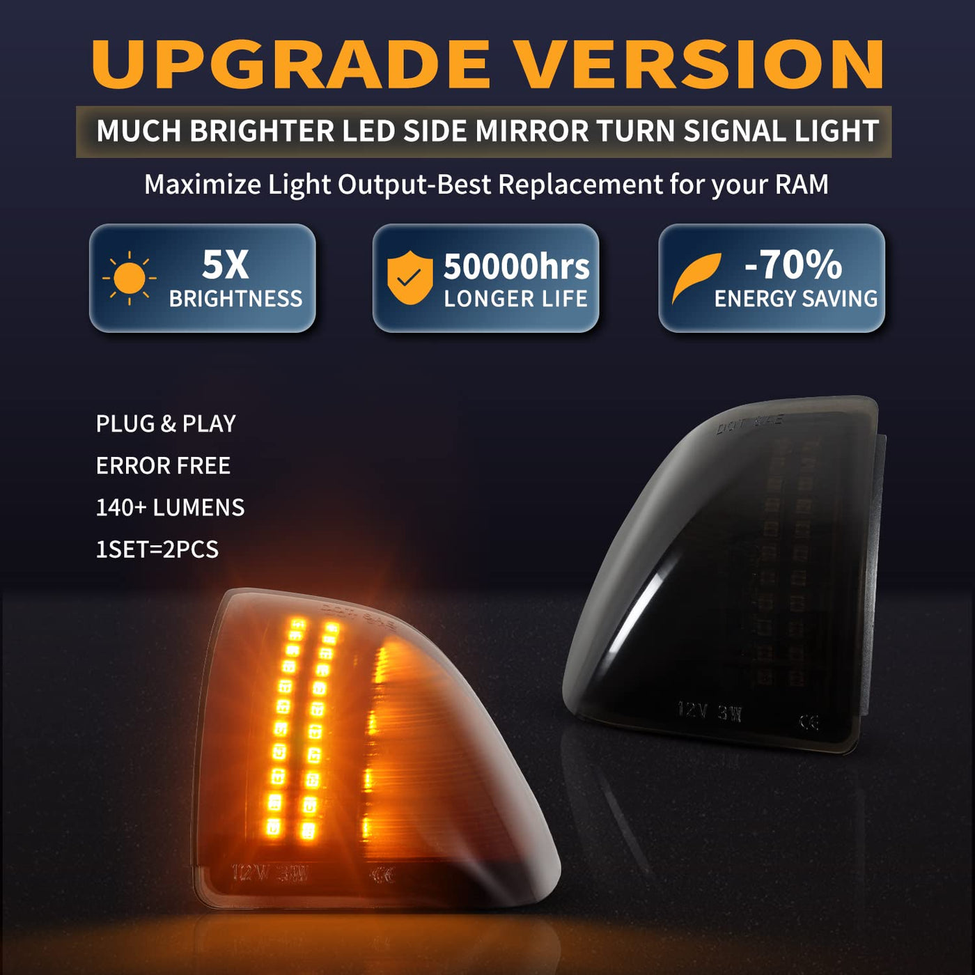 Led Sequential Mirror Turn Signals Lights Towing Mirror Lamps Indicator 2PCS, Smoked Len Compatibility: Dodge Ram 1500 2010-2021 Dodge Ram 2500 3500 4500 5500 2010-2018 (Only Fits for Tow Mirror with Turn Signal Light Models) Features: LED Color: Sequential Amber LEN Color: Smoked Housing Color: Black Voltage: 12V Material: PC lens, ABS plastic housing Number of Bulbs: 54pcs Placement on Vehicle: Side Mirror Turn Signals 5X Brighter than OEM Bulb Simple Installation, plug & play, direct-fit replacement, no modification Non-polarity, no need to worry about negative and positive connections Package Includes: 2x Side mirror lights