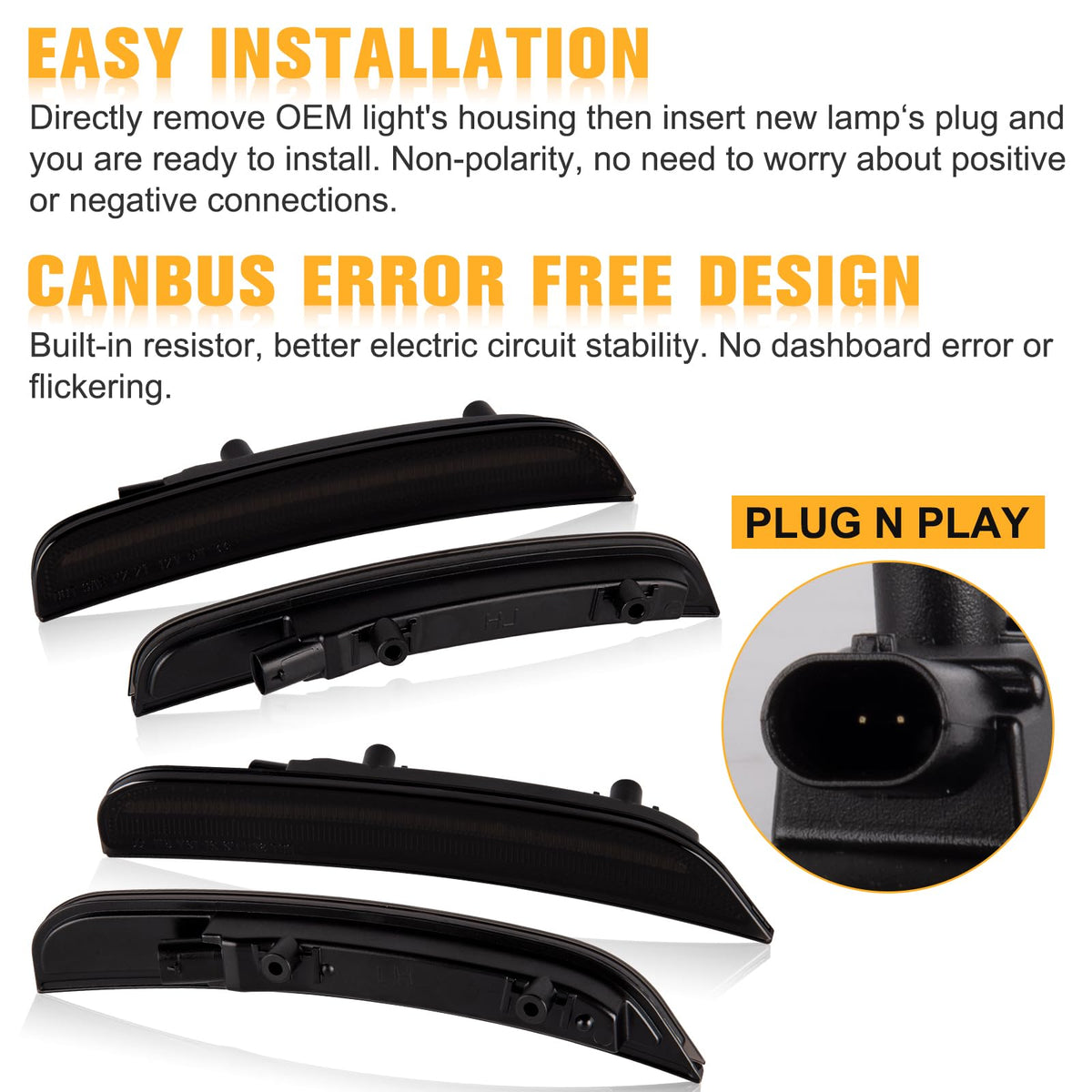 Amber/Red LED Front Rear Fender Marker Light Kits for D-odge Charger(4pcs) Compatibility: 2015-2022 Charger OEM part number: 68214405AA / 68214404AA / 68214127AA Features: Lens Color: Smoked Lens Light color: Front Amber / Rear Red Housing Color: Black Voltage: 12V Material: PC lens, ABS plastic housing Number of Bulbs: 54pcs front / 60pcs rear Waterproof: IP67 Placement on Vehicle: Front / Rear Fender Left & Right Easy install, no modification, no wires, directly plug and play Non-polarity, no need to worry about negative and positive connections Package Including(4pcs): 2 X Front Amber Side Marker Lamps 2 X Rear Red Side Marker Lamps