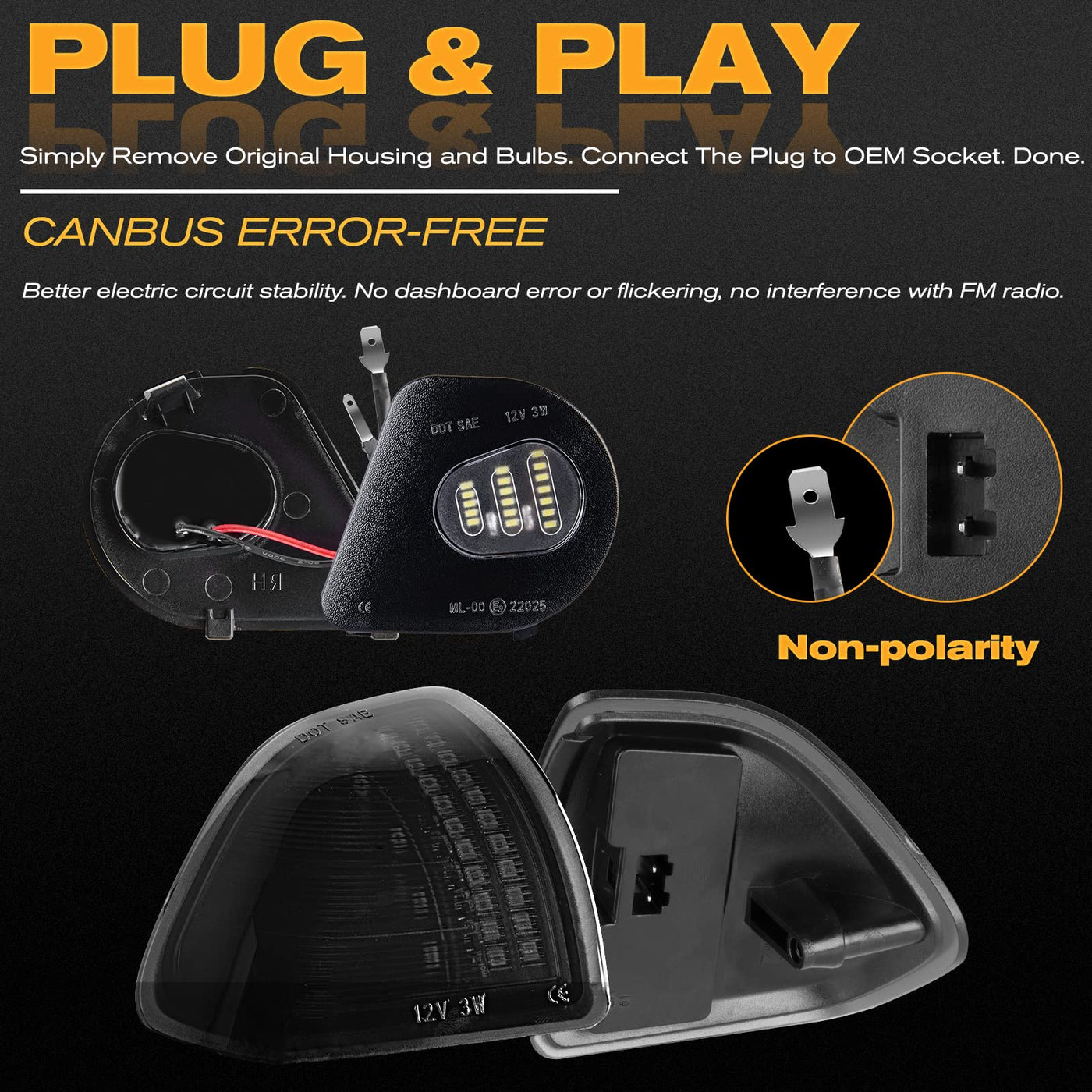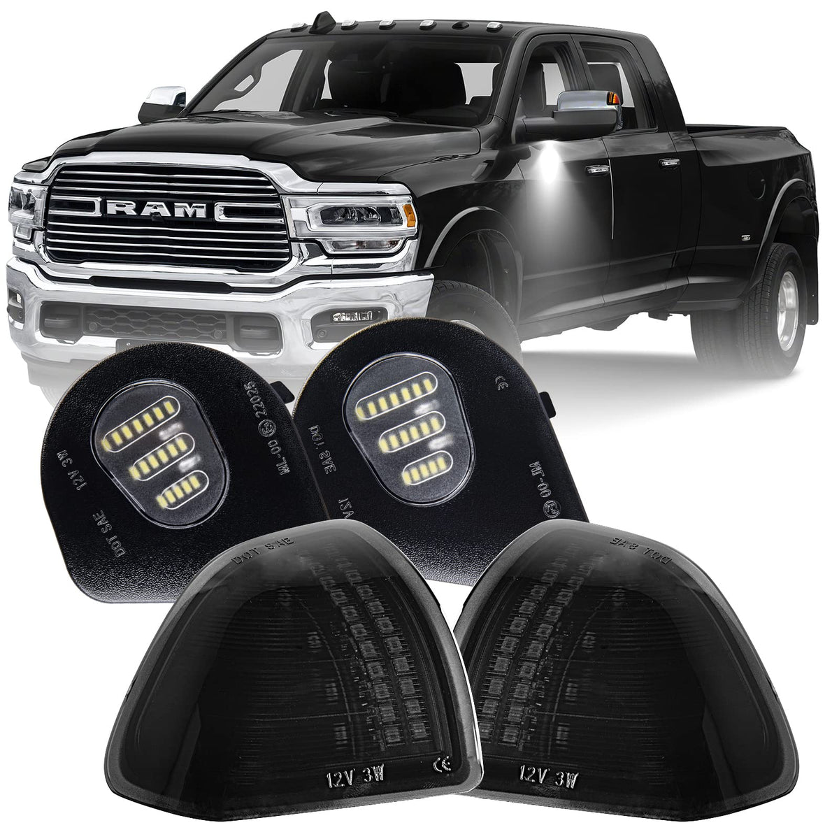 Led Sequential Mirror Turn Signal Lights Towing Mirror Puddle Lamps Kits Indicator 4PCS, Smoked Len Compatibility: Dodge Ram 1500 2010-2021 Dodge Ram 2500 3500 2010-2019 Dodge Ram 4500 5500 2011-2018 (Only Fits for Tow Mirror with Turn Signal Light Models) Features: LED Color: Sequential Amber Mirror Turn Signal+White Puddle Light LEN Color: Smoked Housing Color: Black Voltage: 12V Material: PC lens, ABS plastic housing Placement on Vehicle: Side Mirror Turn Signals/ Under Mirror Puddle Light 5X Brighter than OEM Bulb Simple Installation, plug & play, direct-fit replacement, no modification Non-polarity, no need to worry about negative and positive connections