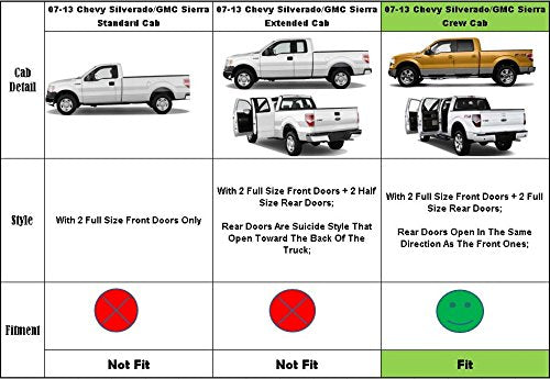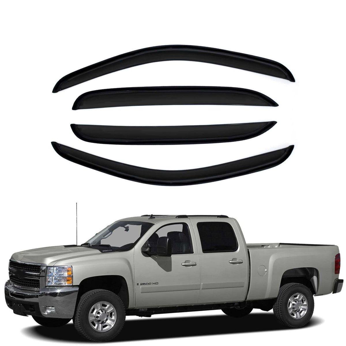 Installation instruction is not included,please check the sample installation picture above for reference Note:Crew Cab model has 2 full size front doors and 2 full size rear doors that open in the same direction.Please check the following picture for more details about the cab difference. Color Dark Smoke TintItem's-condition-function * Fully window protected from sun shade, wind, rain, snow deflector. * Help reduce heat buildup in park vehicles by allowing air in when partially open. * Long lasting material designed to withstand the rigors of the elements. * Make it possible to leave the windows down a few inches to get fresh air even on rainy days. * Comes With Automotive-Grade Double-Sided Tapes.Easy Installation. * Dramatically Improve Styling & Appearance.