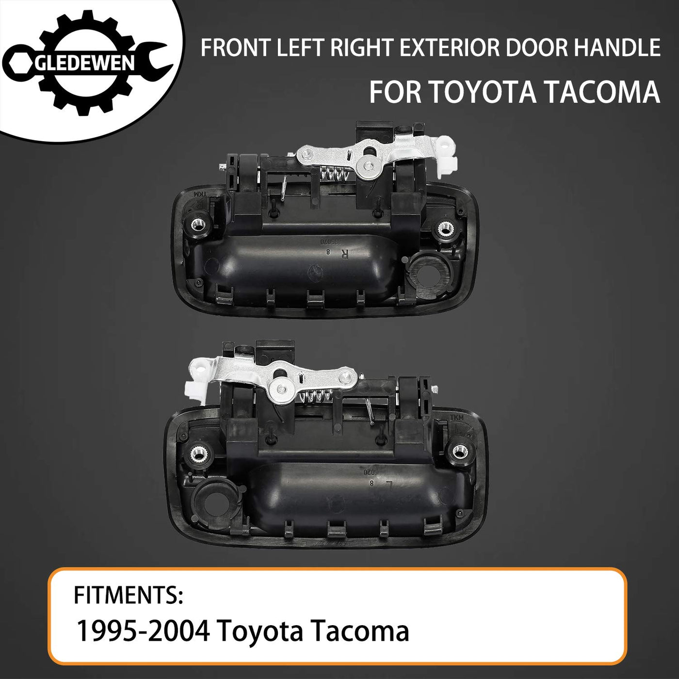Q: What vehicles are compatible with the Gledewen Exterior Door Handle?A: The Gledewen Exterior Door Handle is compatible with various models of the 1995-2004 Toyota Tacoma, including the Base, DLX, Limited, Pre Runner, SR5, and S-Runner configurations, covering multiple engine options like 2.4L L4, 2.7L L4, and 3.4L V6.